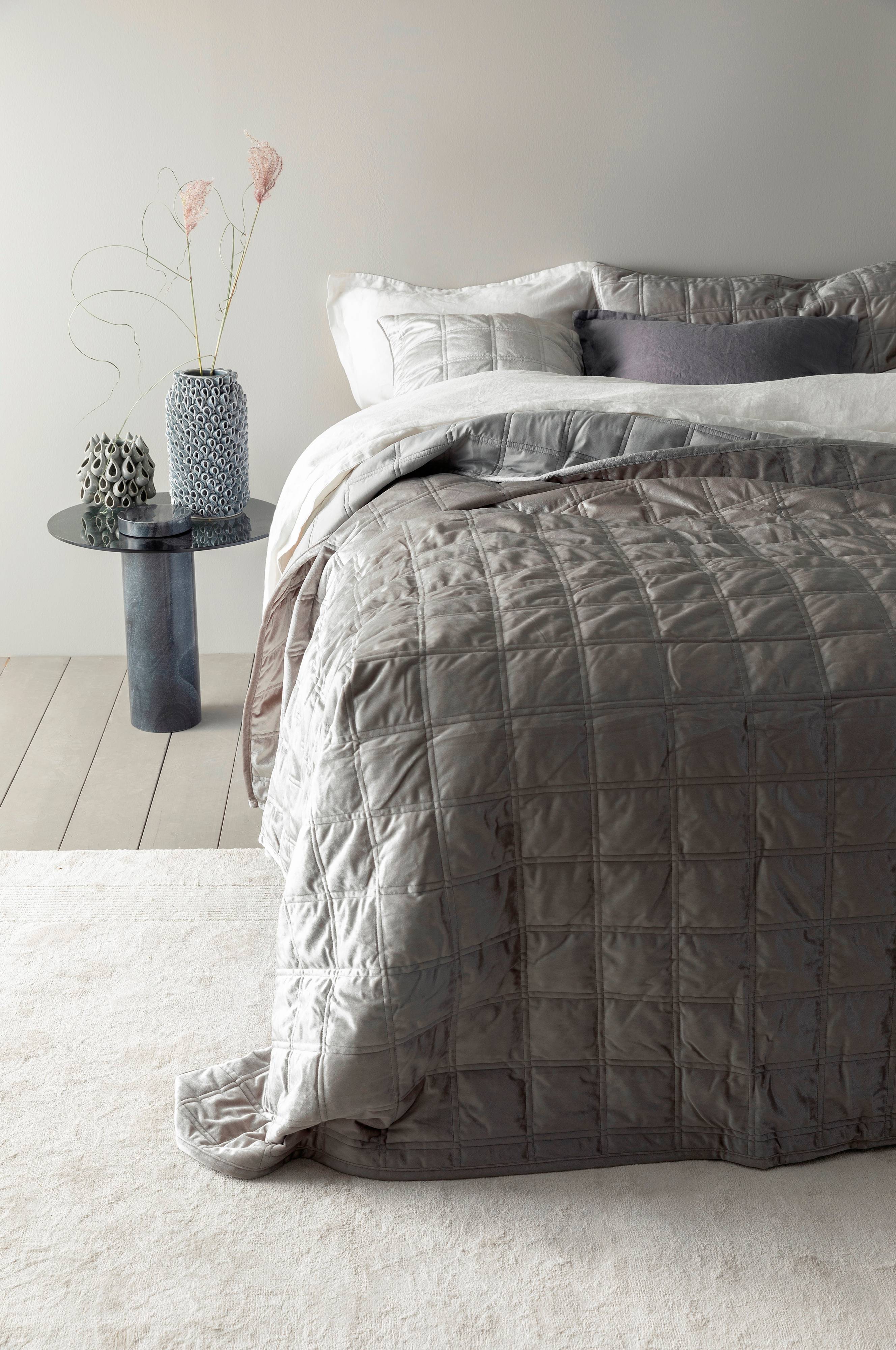 Sengetæppe til dobbeltseng. Sengetæppet er i quiltet velour med syede tern og matchende velourbagside. Pudebetræk medfølger ikke, købes separat.