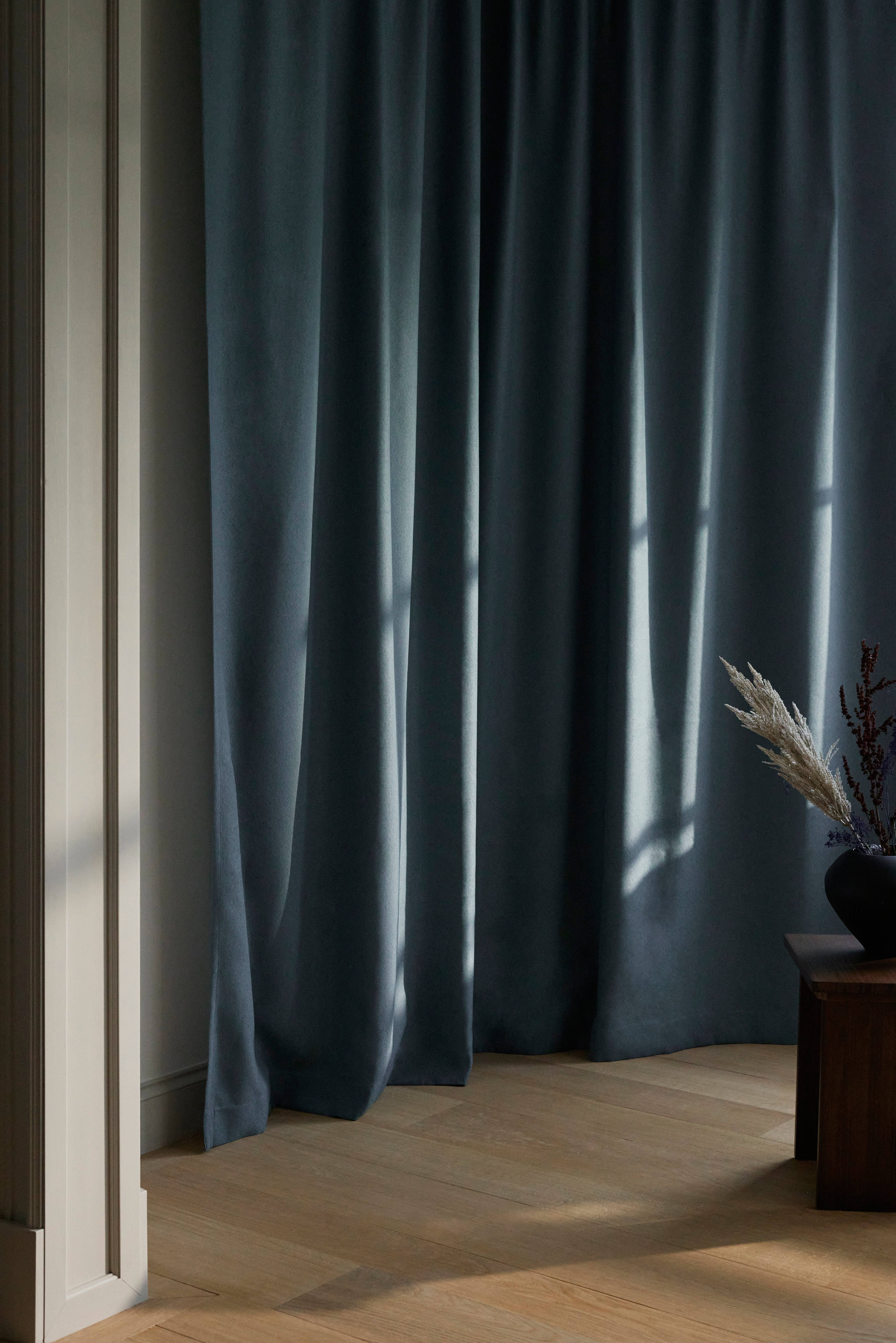 DEJA er et tidløst mørklægningsgardin i et lidt grovere vævet stof. Gardinet har en vævet for- og bagside med et sort mellemlag, som giver en mørklægningseffekt uden at belægge stoffet. Vævningen giver gardinet et rustikt udtryk med struktur og en levende farvenuance. Gardinet har et flot fald og en behagelig drapering, og bagsiden er lige så flot som forsiden. Vær opmærksom på, at de forskellige farver varierer i mørkhed, og at mørke farver er mørkere, mens de lyse farver er mere lysreducerende. Den klassiske farveskala indeholder neutrale farver, som blender ind uden at tage fokus. DEJA-gardinet er fremstillet af certificeret genbrugspolyester. Længderne har påsyede multifunktionelle bånd i toppen, og de kan hænges op ved hjælp af fingerkroge, en kanal og en skjult bøjle.