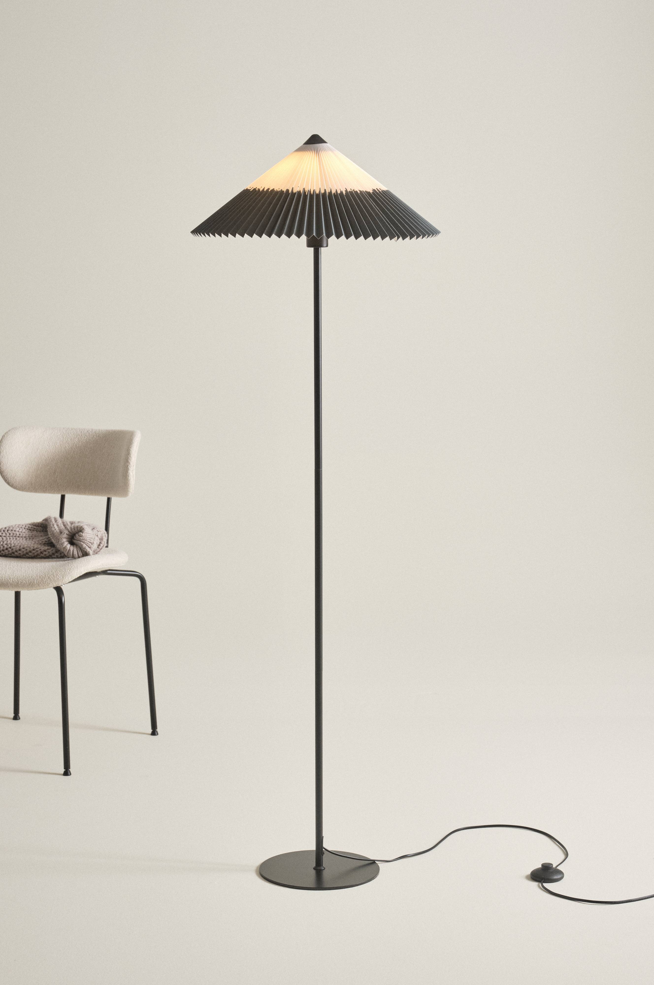 Gulvlampe med plisseret tekstilskærm og fod i lakeret metal. Skærmen er flot farvet med let batik-look. Sort ledning i plast med afbryder på ledningen.