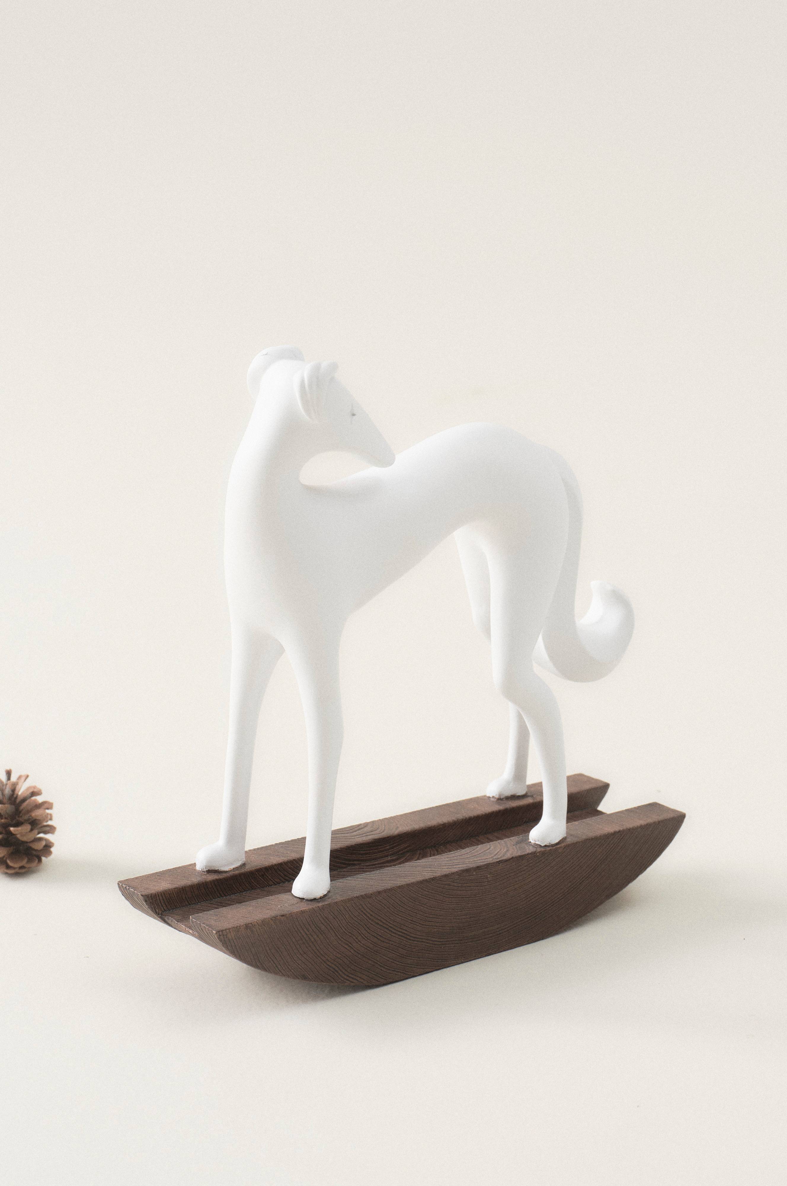 Håndlavet skulptur af polyresin. Den hvide, smukke greyhound inspireret af Saluki hunderacen er stilfuldt skulptureret. Fundamentet er en vippe, der er skulptureret som et tværsnit af en træstamme med årringe i strukturen. De rene linjer og den lyse farve giver et harmonisk og venligt indtryk. Det fine håndværk gør hver skulptur unik.