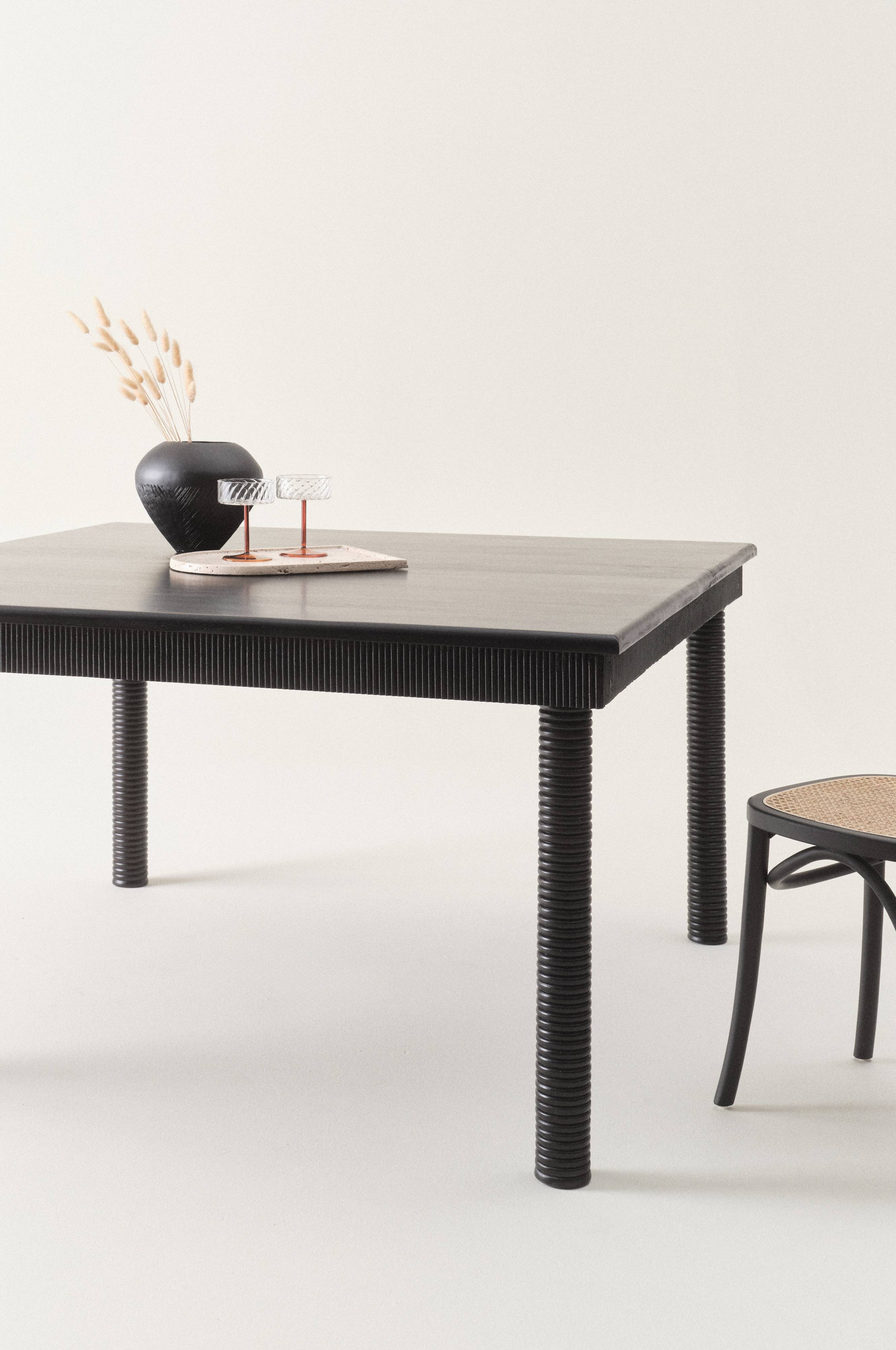 Bordpladen er blødt afrundet foroven og har en riflet kant hele vejen rundt som matches af de drejede riflede ben. Bordet er malet sort og samtidig giver farven mulighed for at se lidt årer, så følelsen af træ bliver til at tage og føle på. Skal færdigsamles. Samlevejledning medfølger.