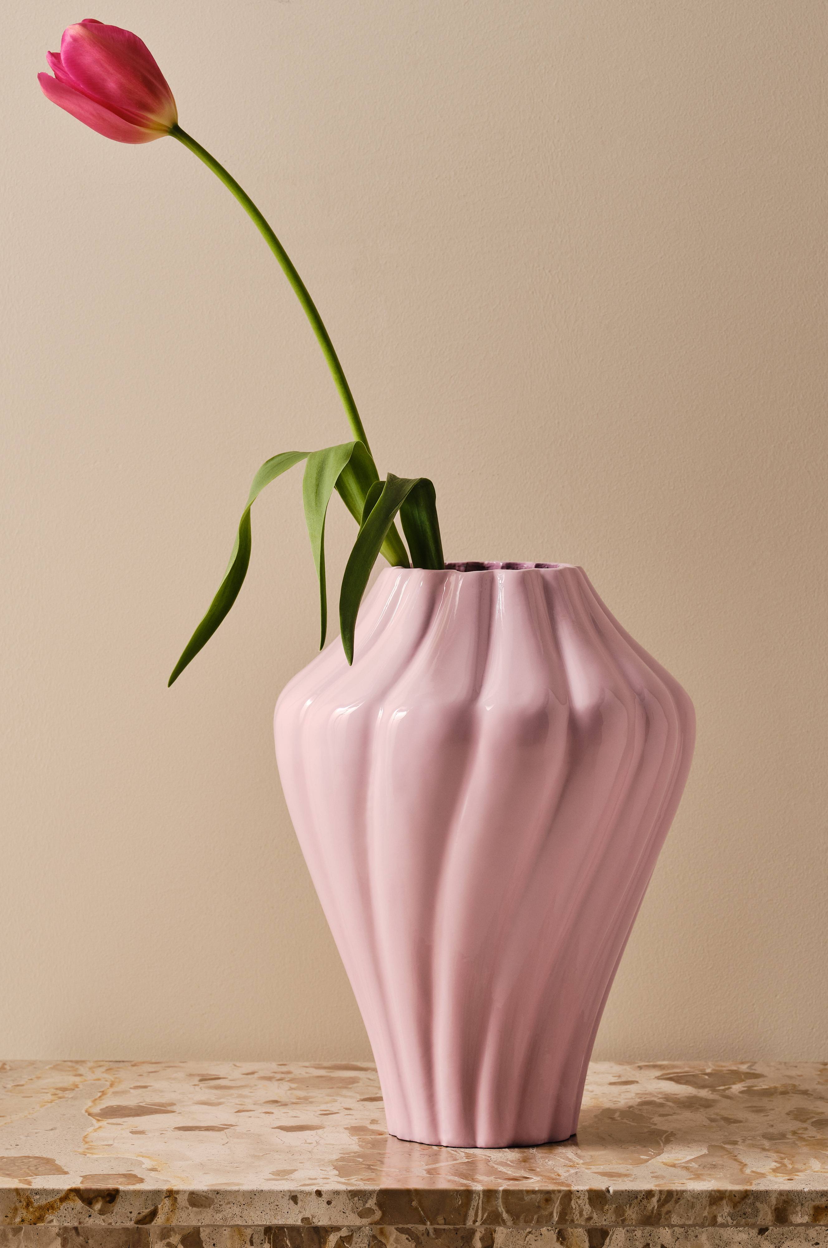 DREAM-vasen, der er fremstillet af aluminium, har en blank pulverlakeret finish og en elegant buet form. Det er en ideel tilføjelse til dem, der søger trendy interiørdesign.