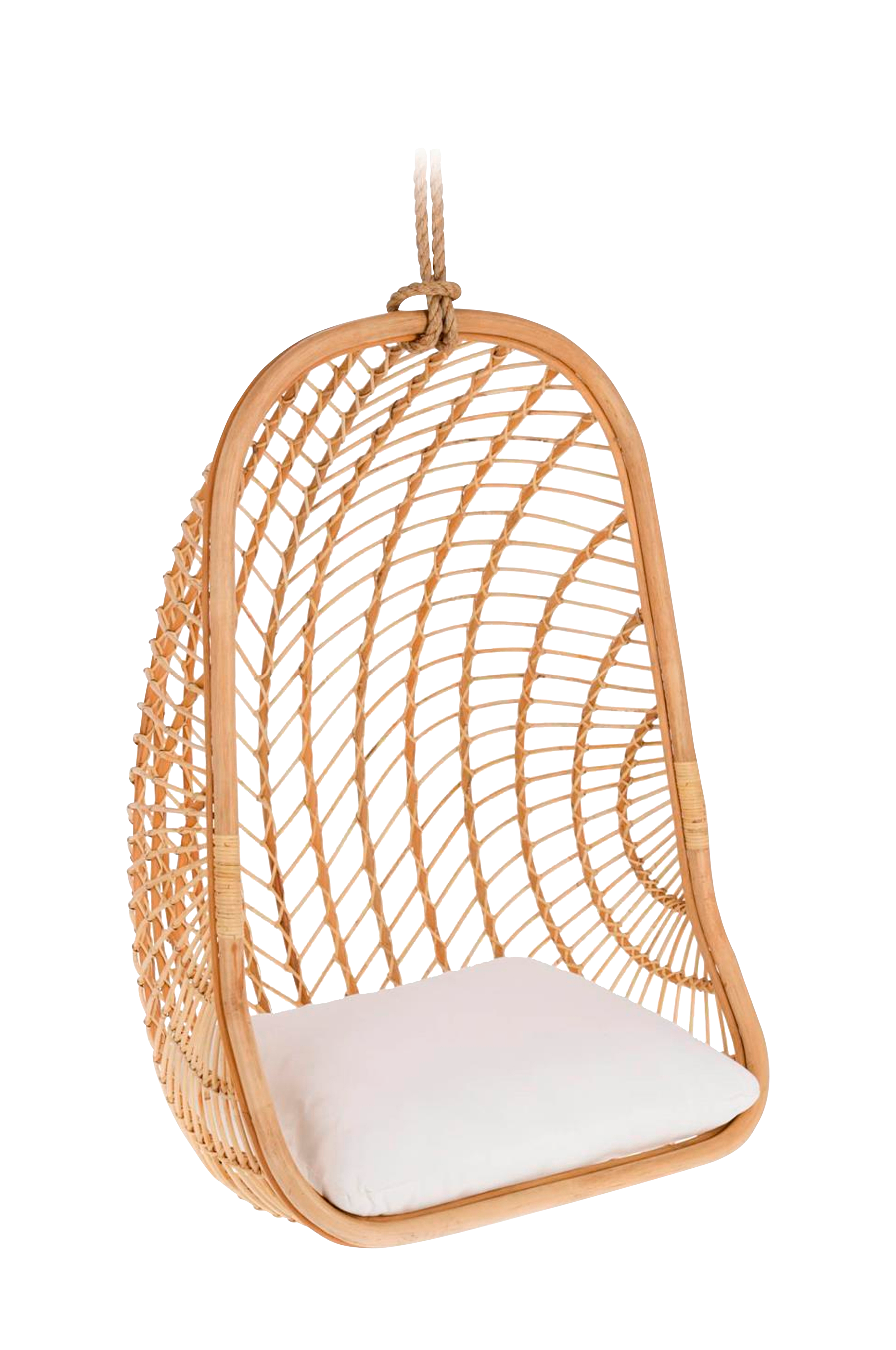 Hængende stol med stel af håndflettet rotting som giver hele stellet en organisk, rund form. Det medfølgende reb med karabinhage gør at du kan placere dette designermøbel et afslappende sted, indendørs eller udendørs under tag. En aftagelig siddehynde medfølger for maksimal komfort.
