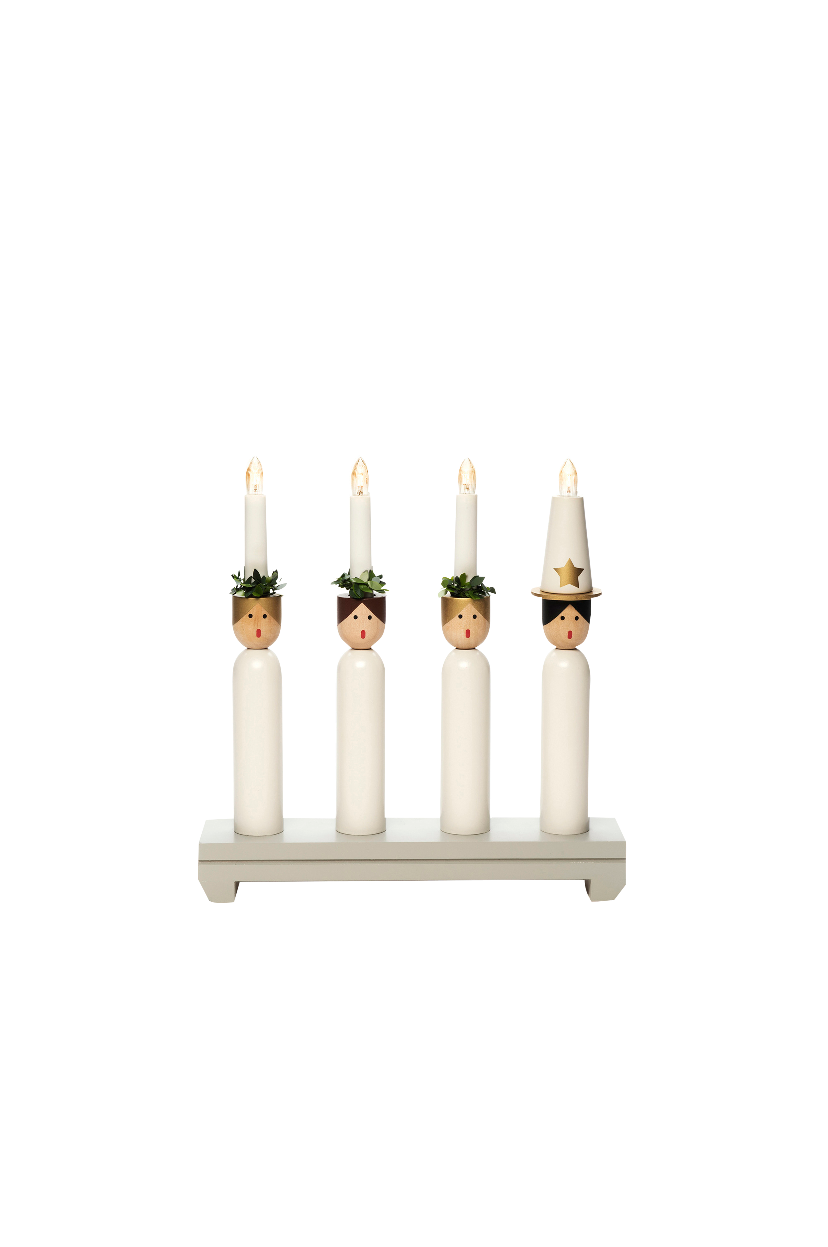 Skandinavisk designet lysestage/borddekoration med 4 lys i form af et luciaoptog i lakeret træ. Varmt hvide pærer. Tilslutningskabel på 1,7 meter. Afbryder til manuelt sluk/tænd. Højde 30 cm, længde 29 cm.