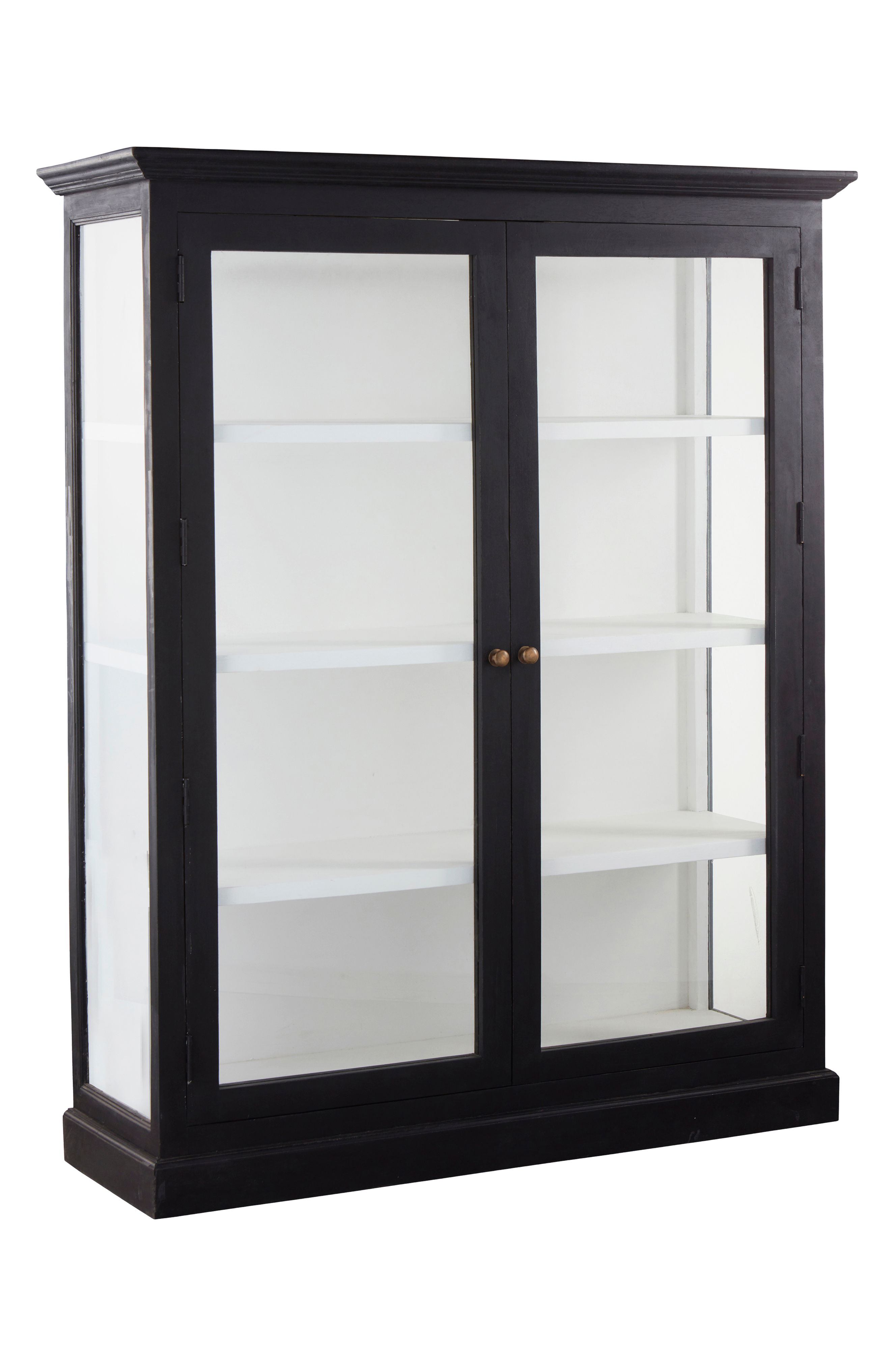 Vitrineskab i rustik model af mangotræ med lys inderside, fint udskåret topliste og sokkel. Skabet har to glaslåger med træramme og messingknopper. Magnetlås på indersiden og tre faste hyldeflader. Skabet har også glas i siderne og hel træbagside.