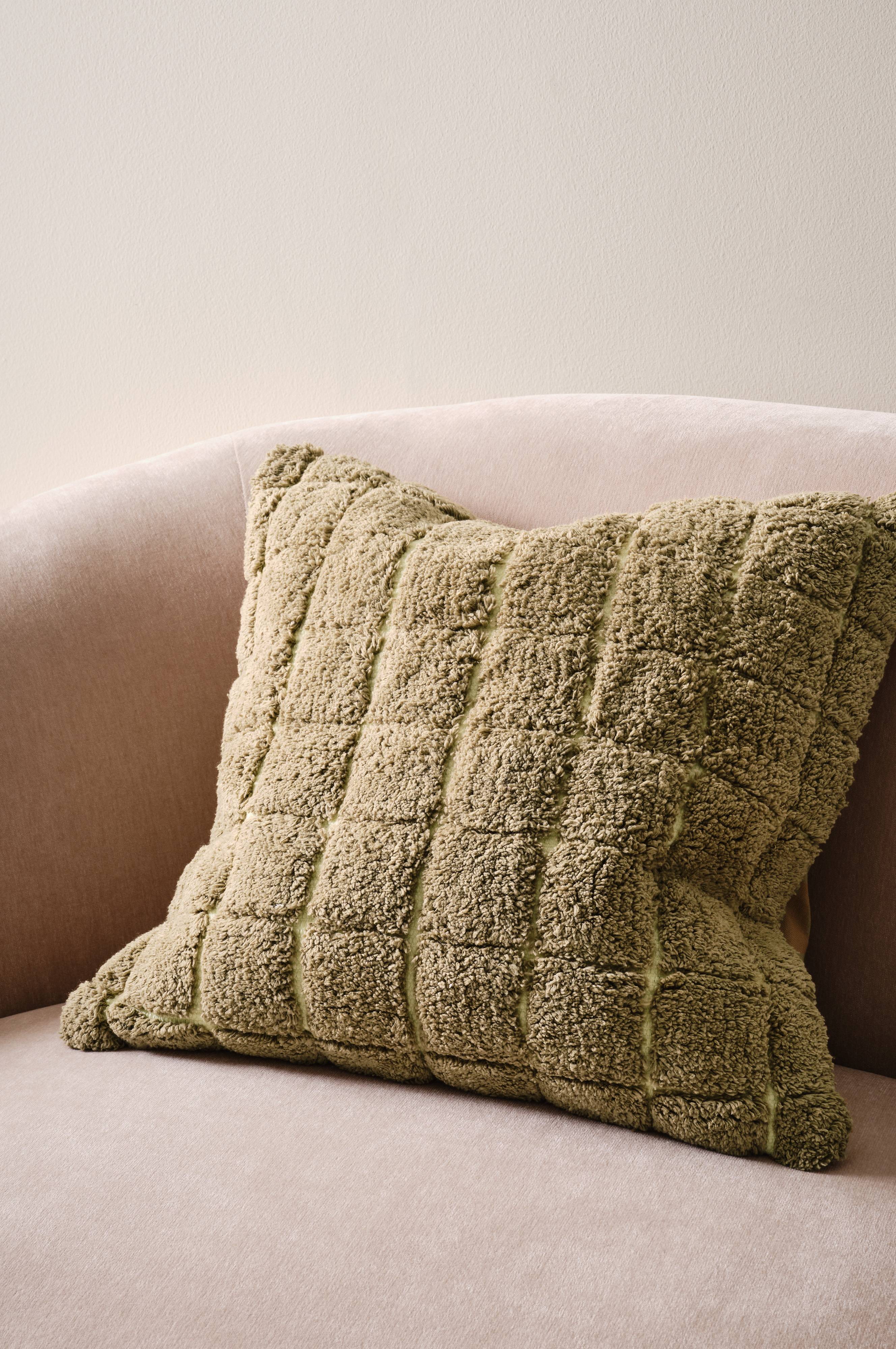 1-pak pudebetræk med tuftede firkanter på et lidt grovere vævet stof. Den bløde, korte luv skaber fin effekt. Bagsiden er et ensfarvet, vævet stof og den har skjult lynlås. Stoffets gramvægt er 440 g/m².