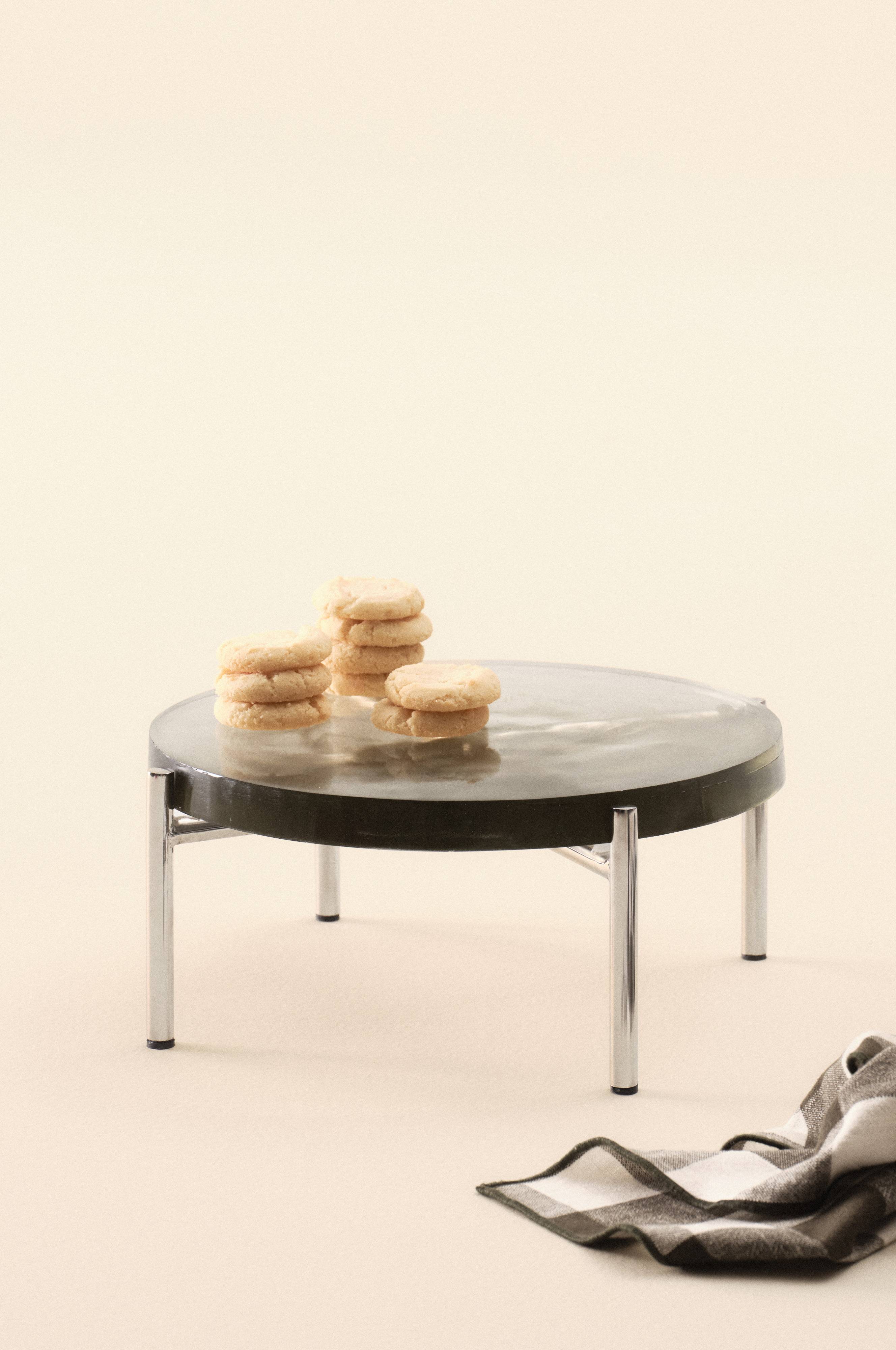 Serveringsfad af glas med stativ af rustfrit stål. Den fine glasplade er tyk og har boblet struktur og grågrøn side rundt om. Stativet har en højglans overflade og står solidt med glaspladen sænket ned i benene. Glaspladen kan løftes ud og bruges uden stativ, hvis du ønsker at stille den direkte på bordet.