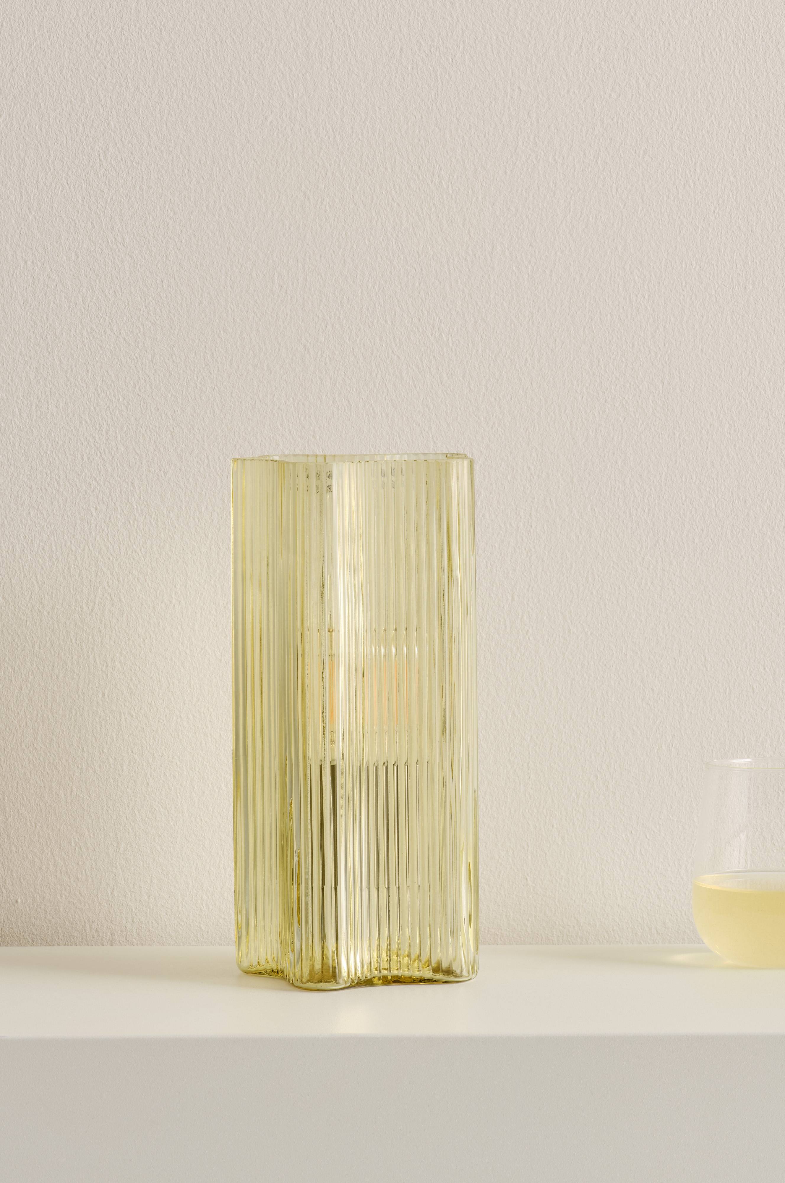 Bordlampe lavet af glas med form som en blomst - når naturen inspirerer er den smuk. Lampen har opadrettet lys kombineret med belysning gennem glasset. Glasset har strukturstriber, der dæmper lyset og giver et smukt skær. Lampens holder er af metal og ledningen er transparent. Strømafbryderen sidder på ledningen. Lampen er ujordet, klasse 2.