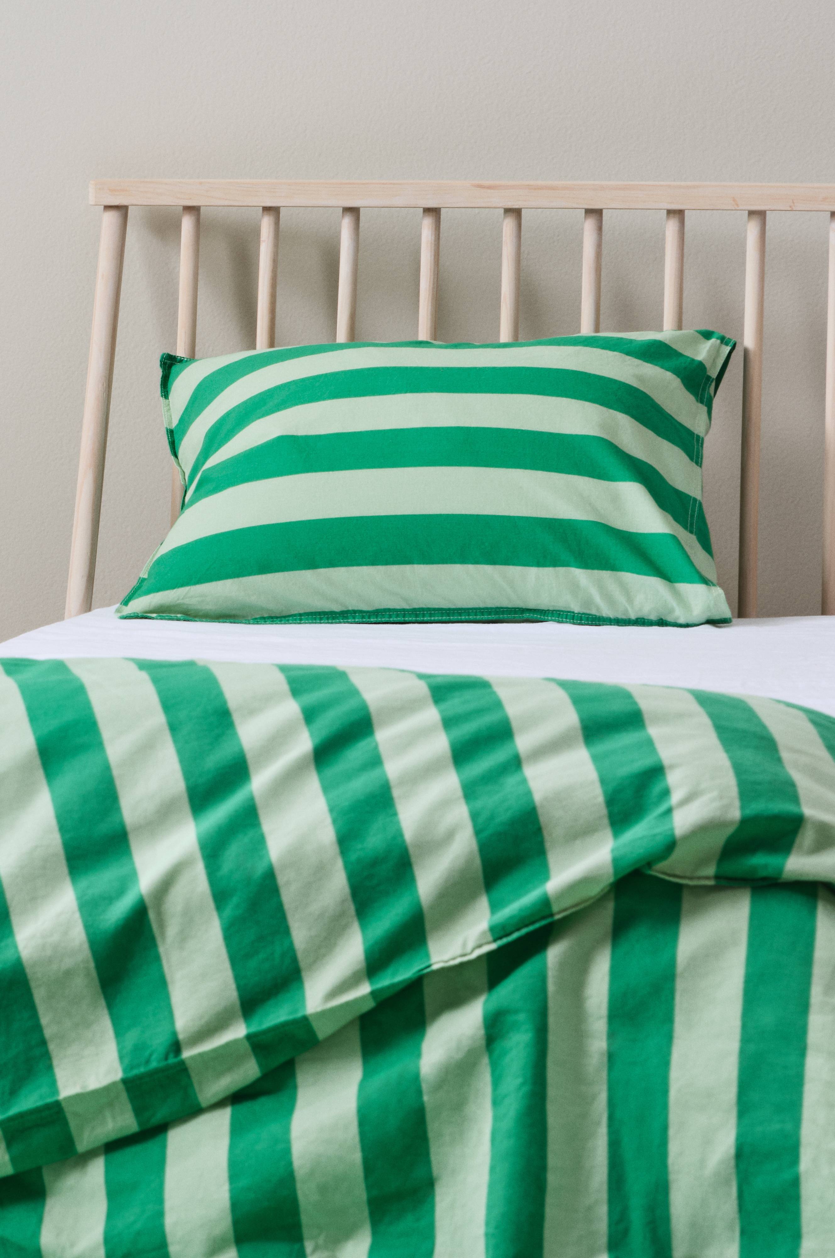 1-pak med pudebetræk i økologisk bomuld. Sættet passer til tremmeseng. Blokstribet mønsterprint er altid friskt, også til de mindste, og at sove i økologisk bomuld føles køligt og skønt mod huden. Pudebetrækket er desuden stykvasket, hvilket betyder, at det er vasket efter syning og er ekstra blødt og lækkert. Dobbeltsøm rundt om giver eksklusivt udtryk. Trådtæthed på 144 tc. (Trådtætheden angiver antal tråde, Thread Count, pr. kvadrattomme i et stof. Jo højere trådtæthed, jo højere kvalitet).