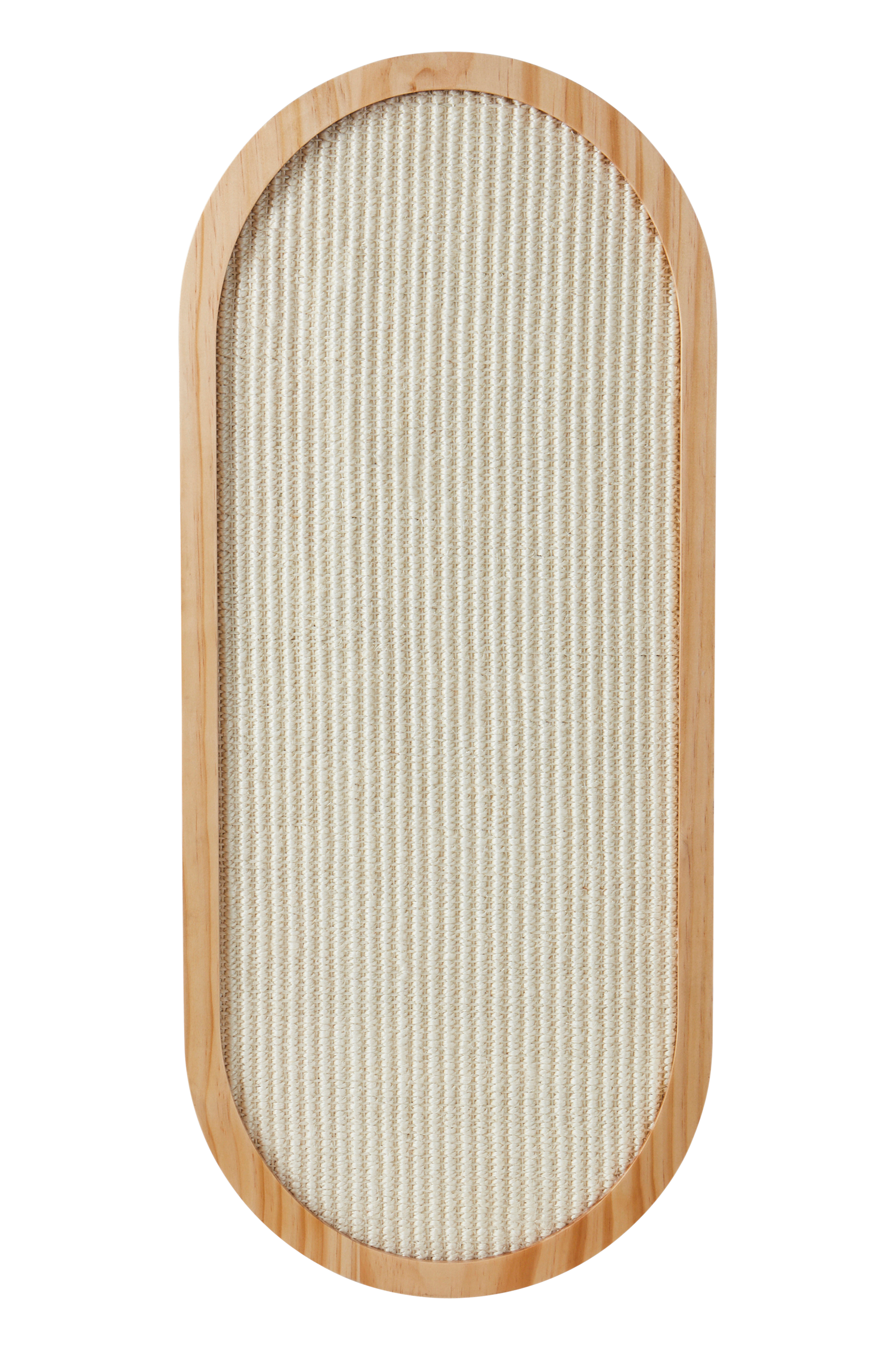 Ovalt kradsebræt af FSC-certifieret MDF og sisal. Sisal er et naturligt materiale, der er holdbart og de fleste katte nyder virkelig at kradse i sisal. Dette kradsebræt har huller på bagsiden til at hænge på væggen med to skruer, men kan selvfølgelig også placeres på gulvet.
