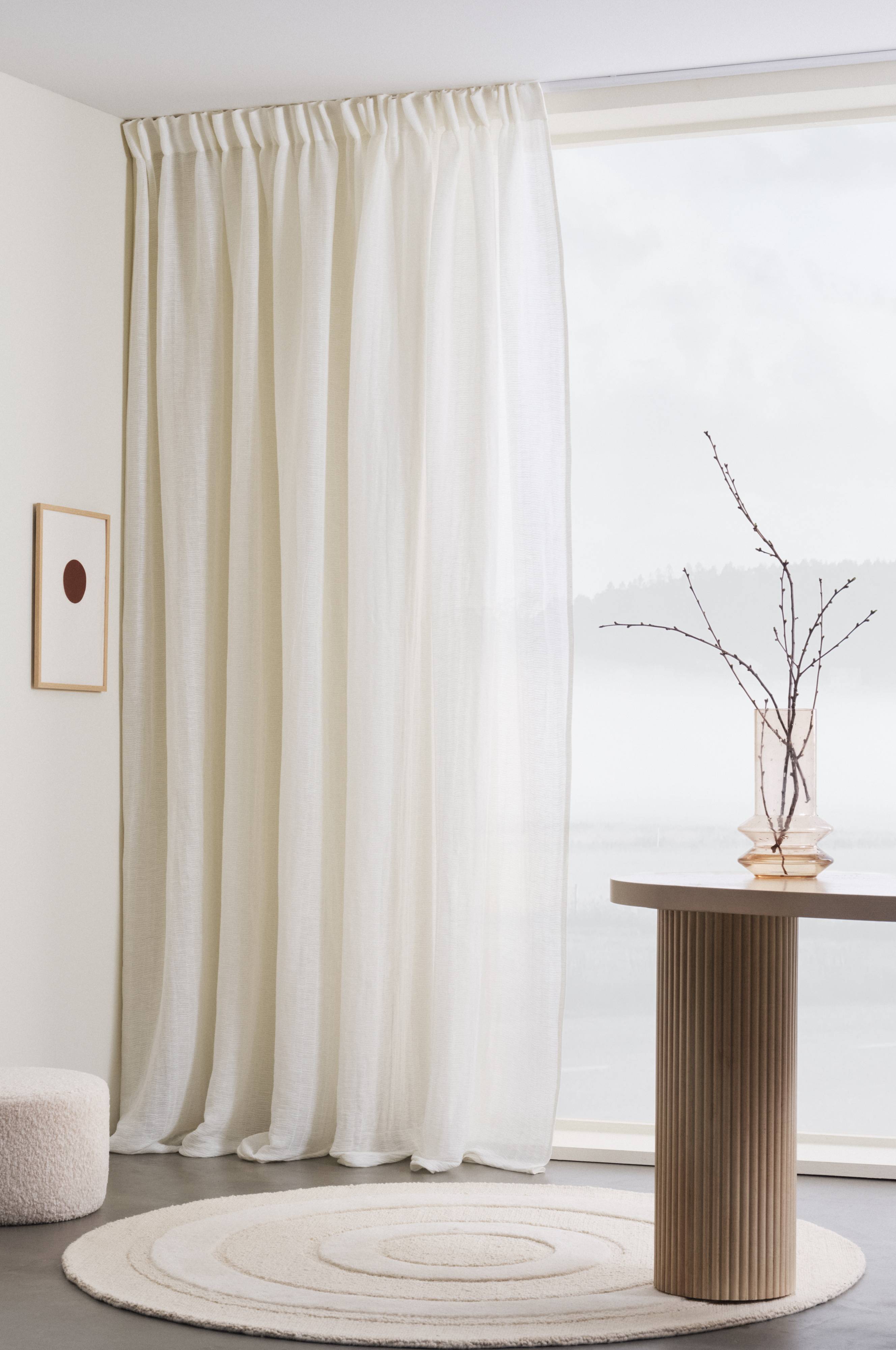 En gardinlængde i let og smidig kvalitet af hør og bomuld. Stoffet har vævede strukturstriber som giver et mere rustikt og levende udtryk til det tynde stof, som har skøn lysgennemtrængning. Den fine hørkvalitet bliver blødere af bomuld som er blandet ind og stoffet er desuden vasket for at få fint fald og blødhed. Længden har påsyet multifunktionsbånd og kan hænges op med fingerhægter, løbegang eller skjult strop. Stoffets gramvægt er 110 g/m².