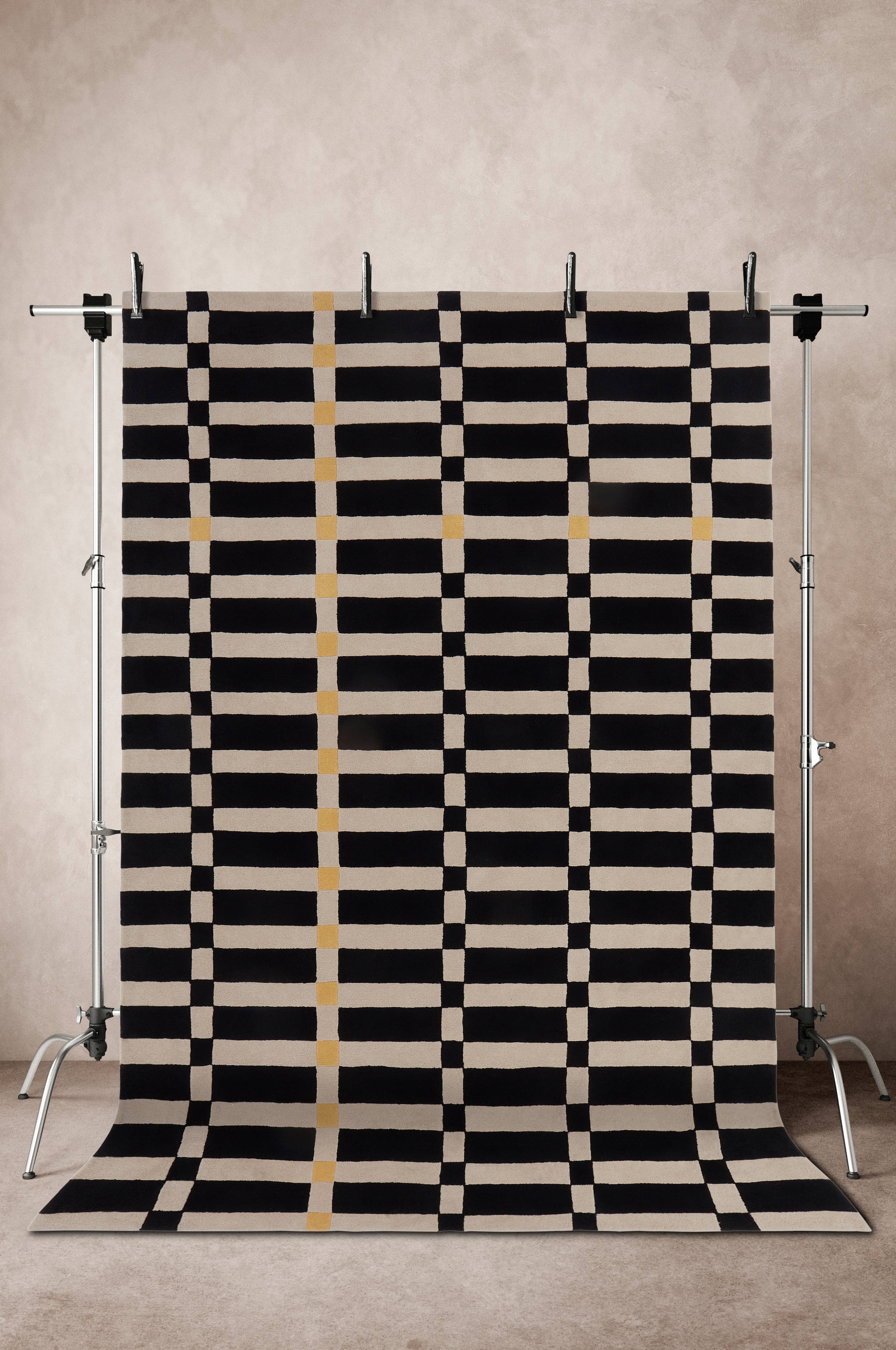 Luksusuldtæppe giver varme og komfort til din stue eller dit soveværelse. Dette store, håndtuftede tæppe har en tætvævet, luksuriøs uldluv oven på en bomuldsbagside. Det kvadratiske mønster med tydelige farver giver et strejf af dybde og elegance, perfekt til at underbygge dit hjems design med stil og varme.