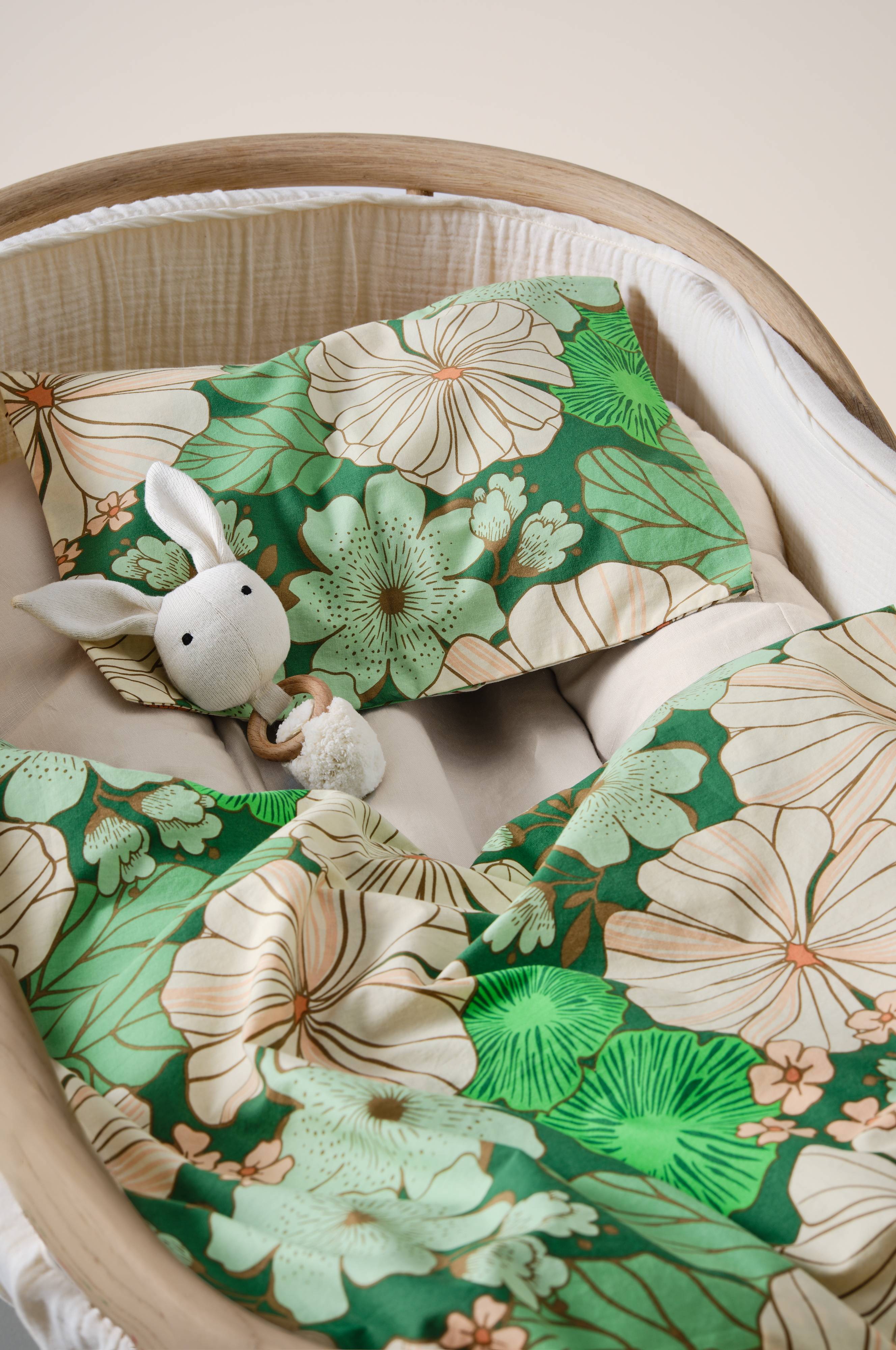 Todelt dynebetræk med et dynebetræk og et pudebetræk i fintrådig, tætvævet bomuldskvalitet. Stoffet har et dejligt blomstermønster trykt i en smuk vifte af farver. Det er også enzymvasket, hvilket giver det en behagelig blødhed og en let slidt fornemmelse. Sættet er velegnet til barnevogne og klapvogne.