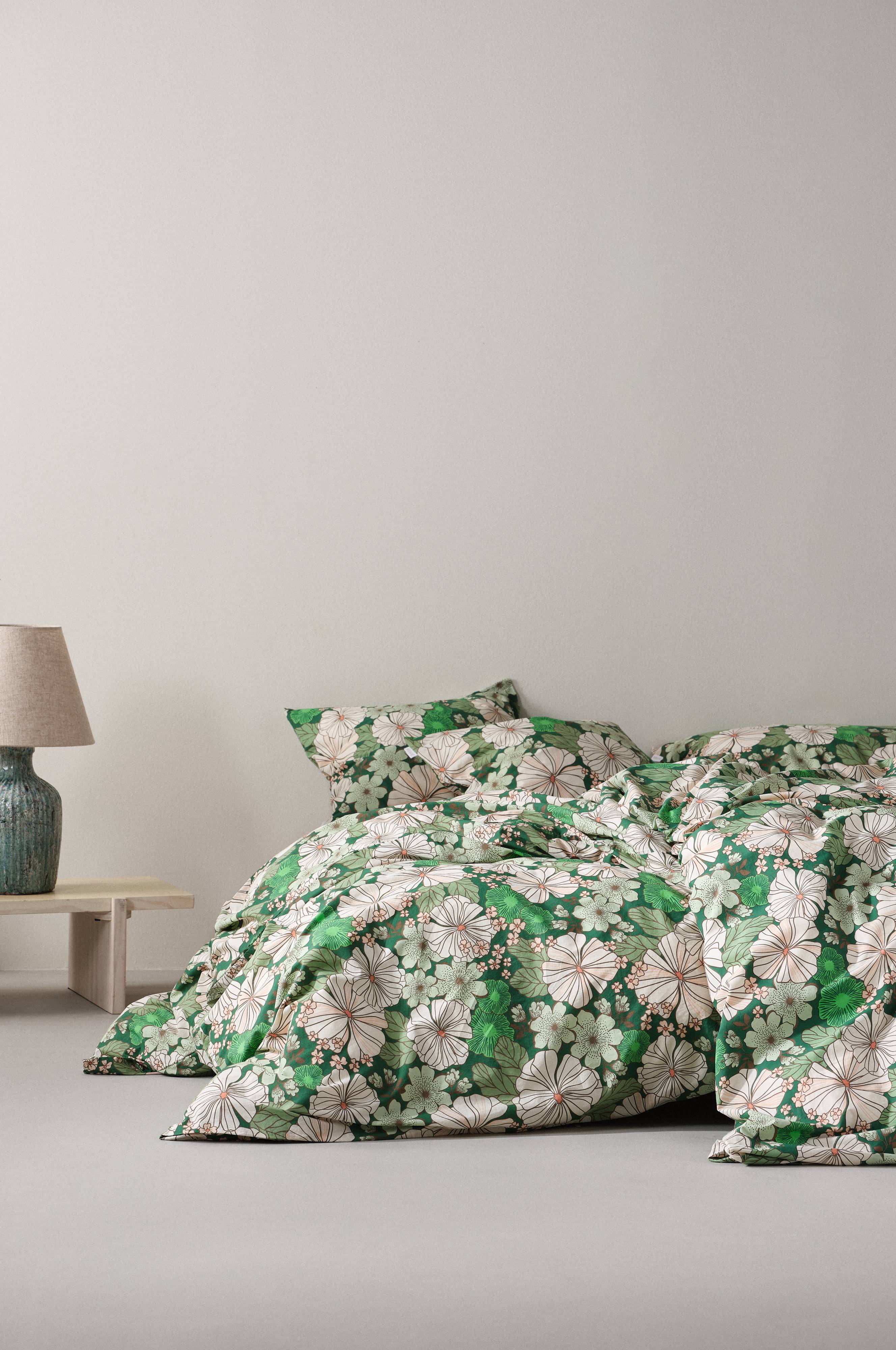 Dynebetræk i fintrådig, tætvævet bomuldskvalitet. Stoffet har et dejligt blomstermønster trykt i en flot farveskala. Det er også enzymvasket, hvilket giver det en behagelig blødhed og en lidt slidt fornemmelse. Dynebetrækket har trykknapper til lukning.
