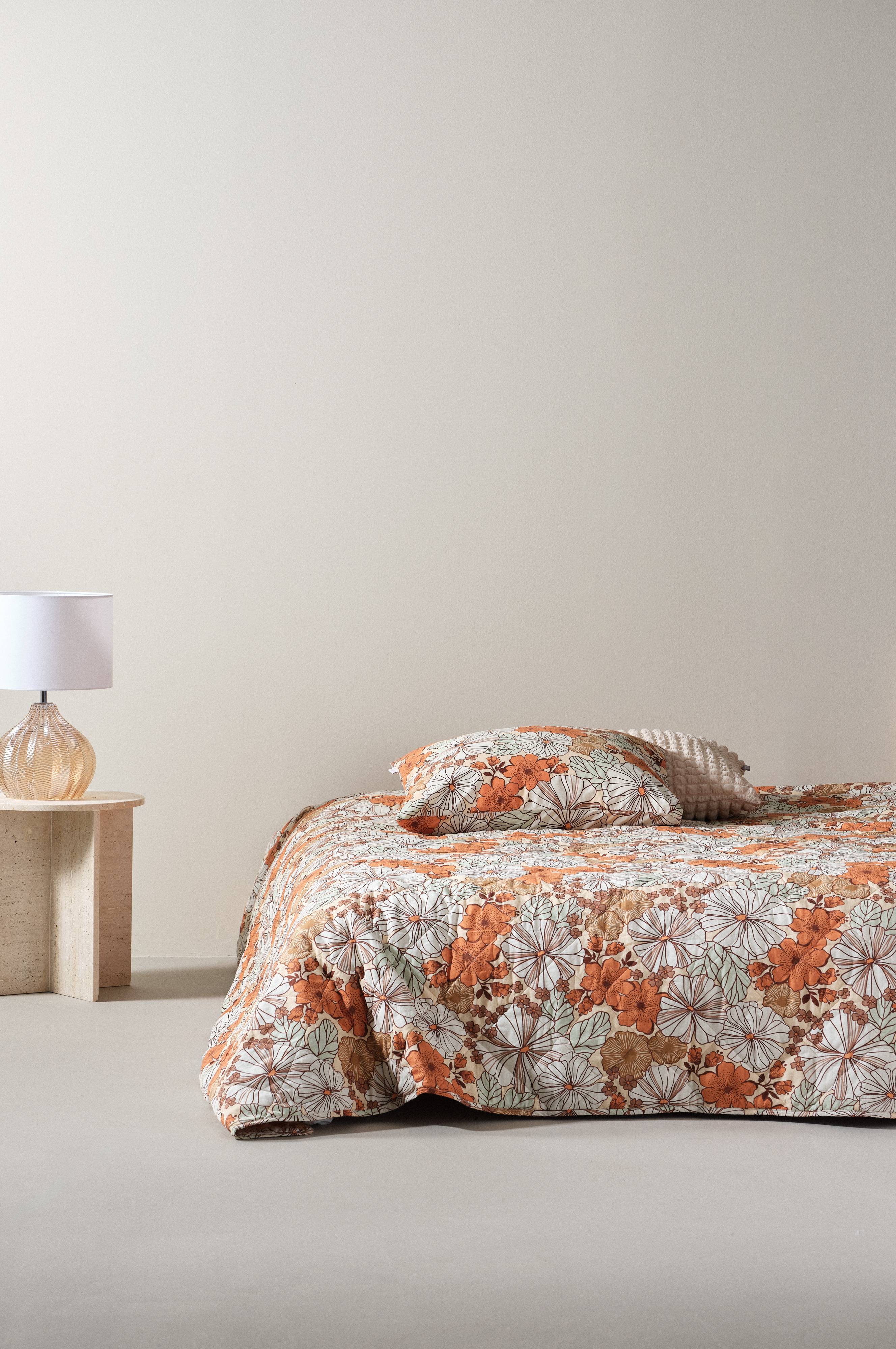 Sengetæppe i fintrådet, tætvævet bomuldskvalitet. Stoffet har et dejligt blomstermønster trykt i en flot farveskala, og det er quiltet, så det lette fyld bliver på plads. Det er også enzymvasket, hvilket giver det en behagelig blødhed og en lidt slidt fornemmelse. Sengetæppet er vendbart med blomster på begge sider og kant hele vejen rundt.