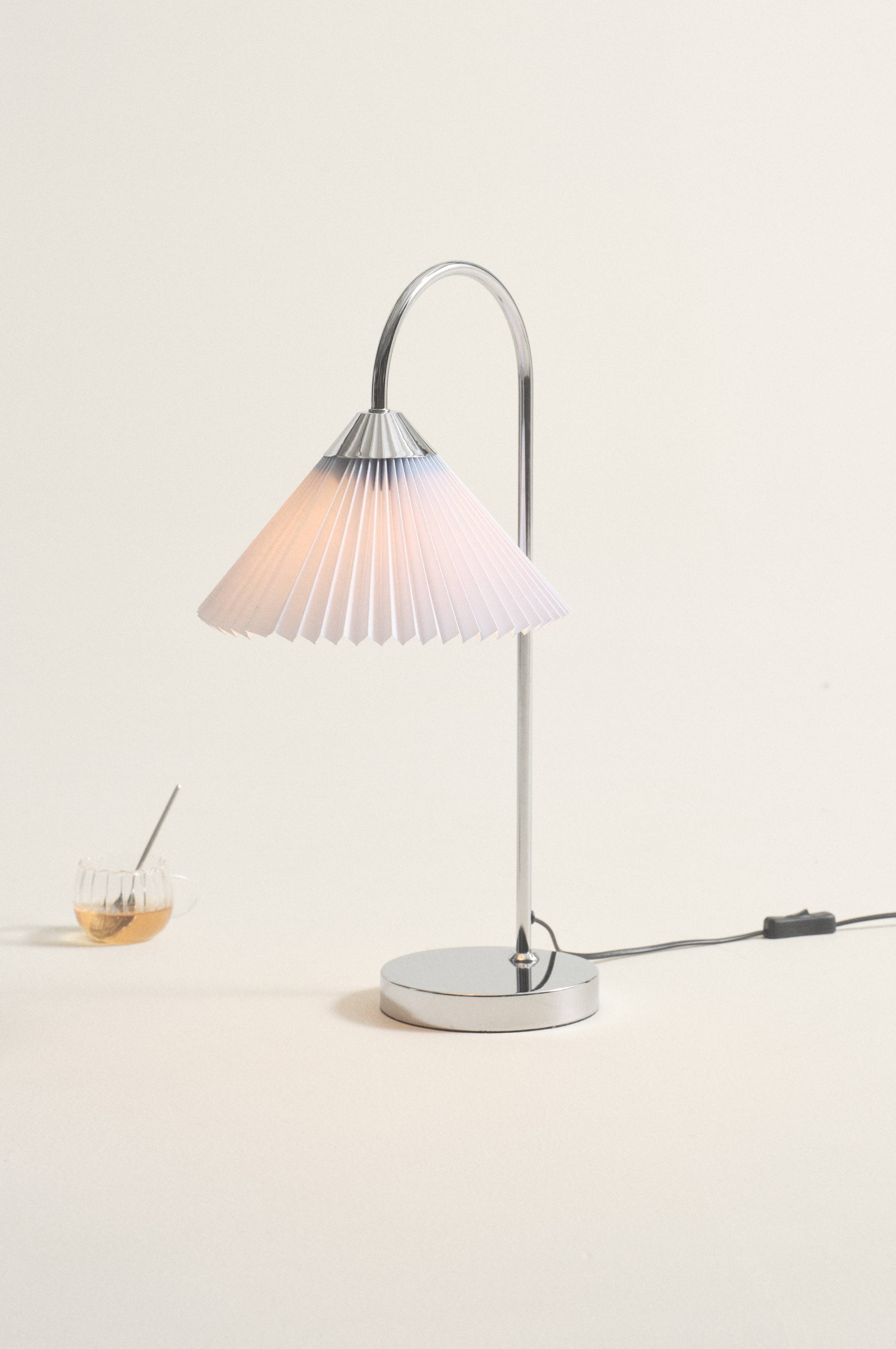 Bordlampe FLORENCE har forkromet, stilren metalfod som matches fint af en plissereret stofskærm. Bøjningen øverst på armen giver lampen et blødere udtryk, der står i flot kontrast til kromfarven. Skærmen har en diskret metalramme og forkromet top. Sort ledning med strømafbryder.