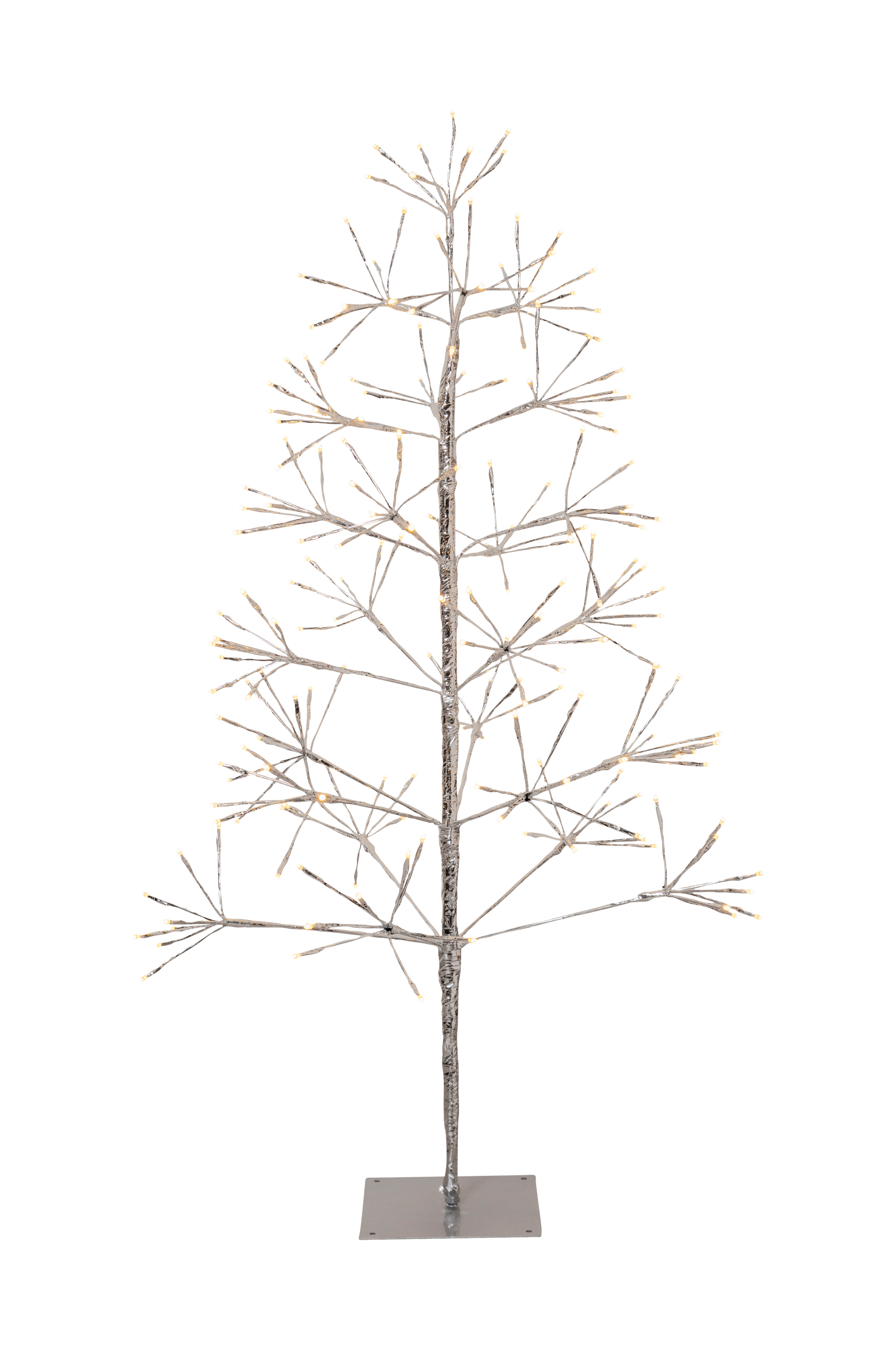 Det sølvfarvede dekorationstræ giver charme til enhver have eller terrasse. Det er 120 cm højt og har 200 LED-lys, der udsender en varm hvid glød og gør udendørsarealer endnu smukkere. Ideelt til at skabe en hyggelig, indbydende atmosfære på aftener, der tilbringes udendørs. Perfekt til dekoration året rundt.