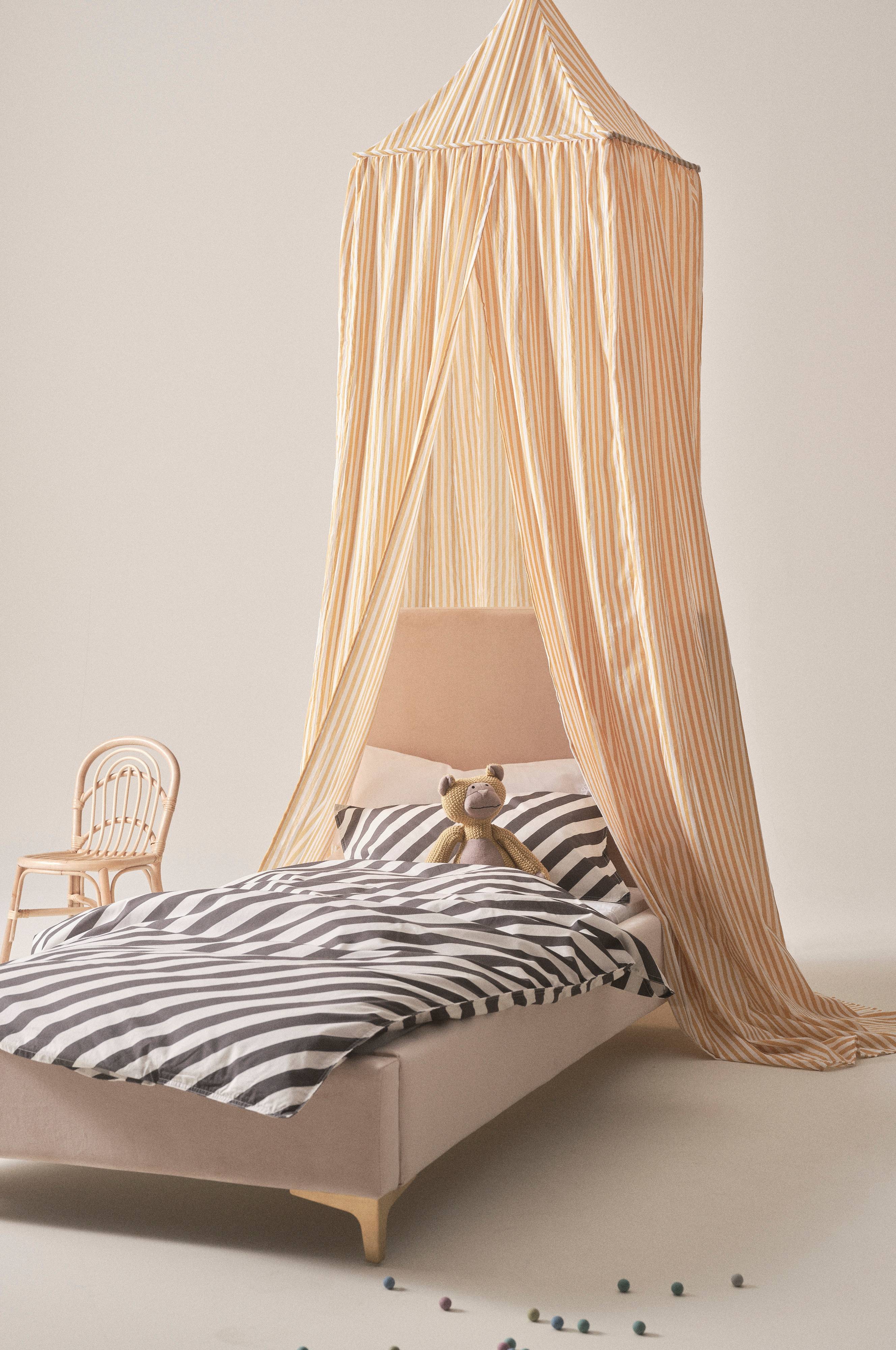 Sengehimmel i smidigt stof af polyester og bomuld med printede striber. Denne sengehimmel er rund foroven og åben foran. En sengehimmel over børnesengen skaber hyggelig atmosfære, det kan blive lidt ekstra hyggeligt att gå i seng. Mønsteret FRANNY findes på mange forskellige dele, så du kan indrette børneværelset med stribet tema.