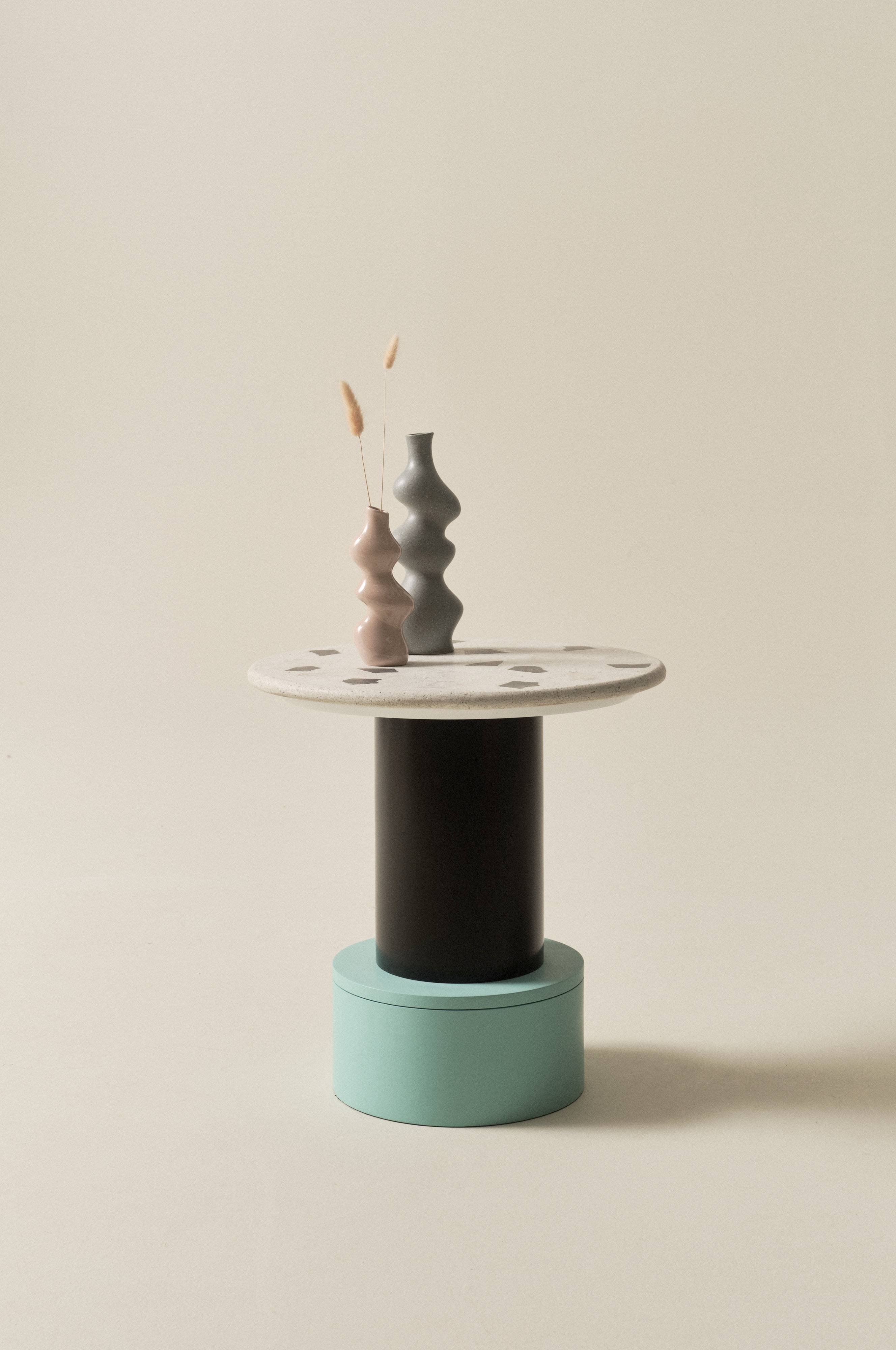Rundt sidebord i skøn materialeblanding. Den runde bordplade er i fin terrazzo og foden i midten er tofarvet og af massivt mangotræ. Søjlebordet FRESNO er spændende og kontrastrigt og leder tankerne hen på engelsk lakridskonfekt.