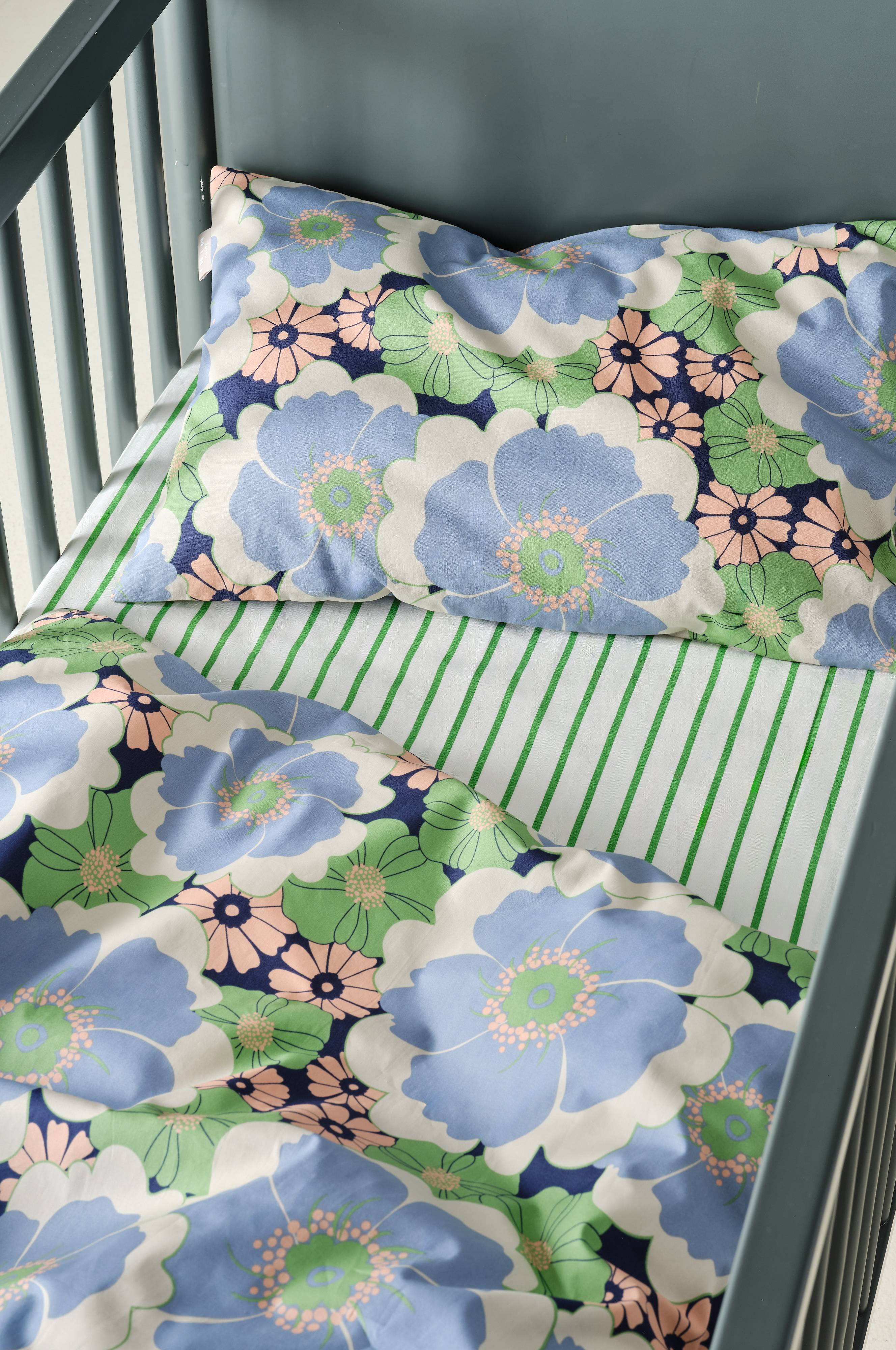 FRIDA-sengesættet giver et charmerende retropræg til ethvert børneværelse. Dette 2-delte sæt med dynebetræk og pudebetræk er fremstillet af miljøvenlig bomuldspercale og har et reaktivt print, der giver langvarig livlighed. Mønsteret er designet af Maria Carlberg. Sættet er designet til at passe i babysenge og passer perfekt sammen med voksenversionen.