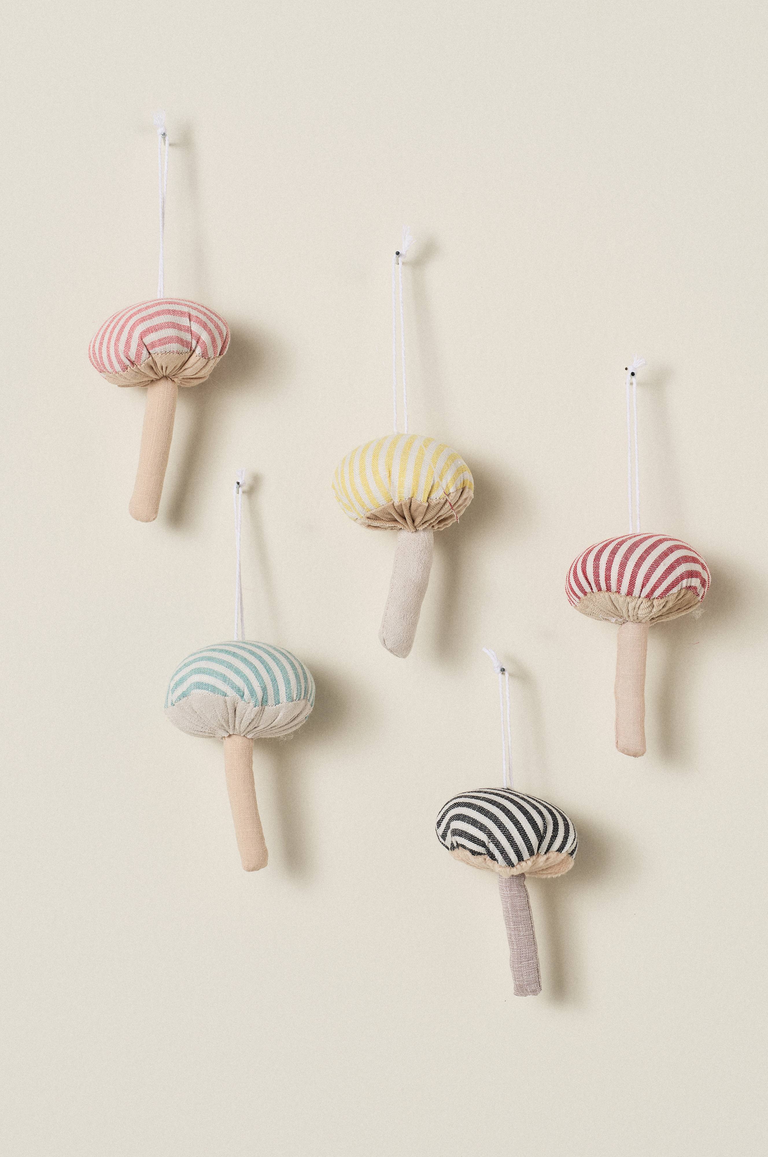 5-pak håndlavede svampe af polyester med polyesterfyld. De fem blødt polstrede små svampe har en bolsjestribet hat i fem forskellige farver sammen med hvide striber. Alle har en lidt længere snor, så du kan hænge dem på juletræet eller dekorere noget andet. Håndværket gør alle unikke.