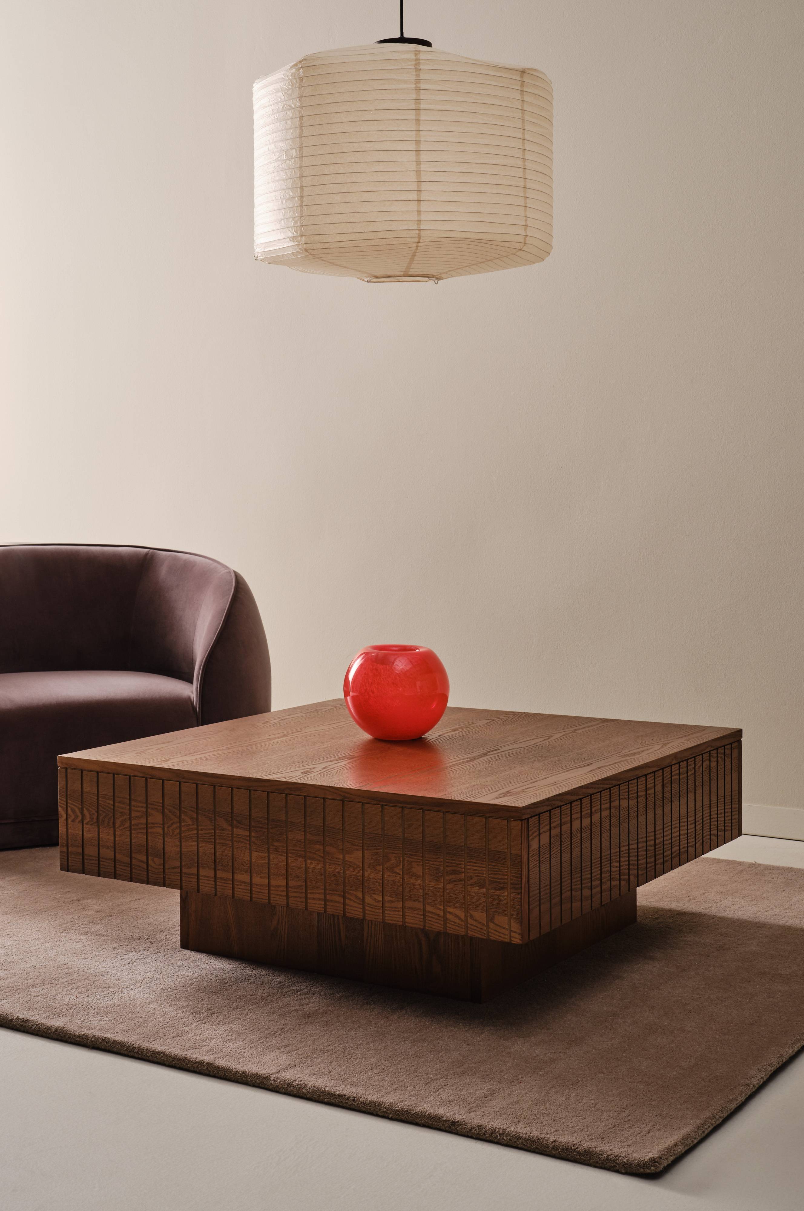 Firkantet sofabord i MDF. Bordet har en mat, blød lak. Bordpladen har en betydelig højde og lodrette, fræsede striber langs siderne. Bordets design er virkelig flot med striberne sammen med den tunge midterbase.