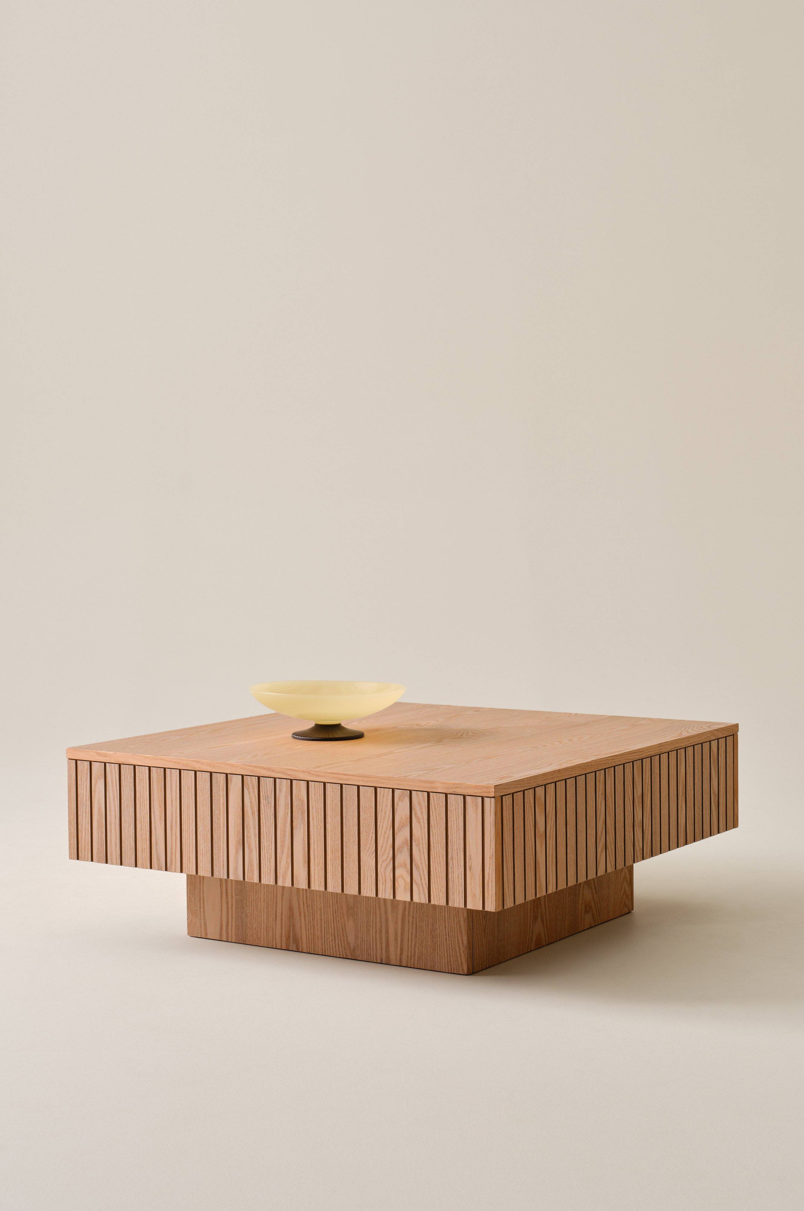 Firkantet sofabord i MDF. Bordet har en mat, blød lak. Bordpladen har en betydelig højde og lodrette, fræsede striber langs siderne. Bordets design er virkelig flot med striberne sammen med den tunge midterbase.