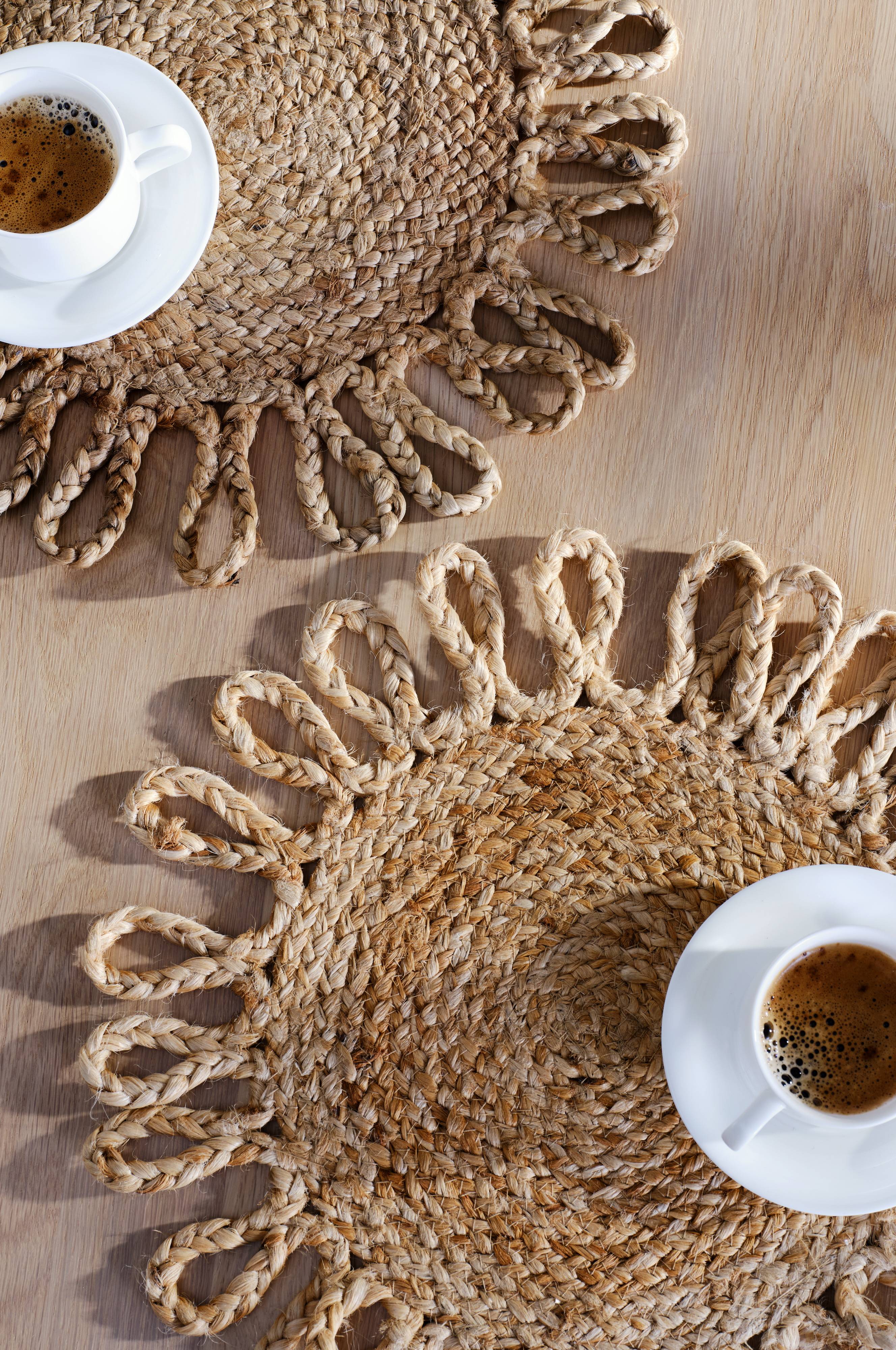 GAIA-sættet med dækkeservietter giver et stilfuldt touch til din spiseoplevelse. Disse runde, flettede dækkeservietter er fremstillet af jute og udstråler naturlig charme. De sælges i en praktisk pakke med to stk. og tilføjer en unik flair til enhver borddækning og forbedrer dit hjem med et organisk, struktureret element.