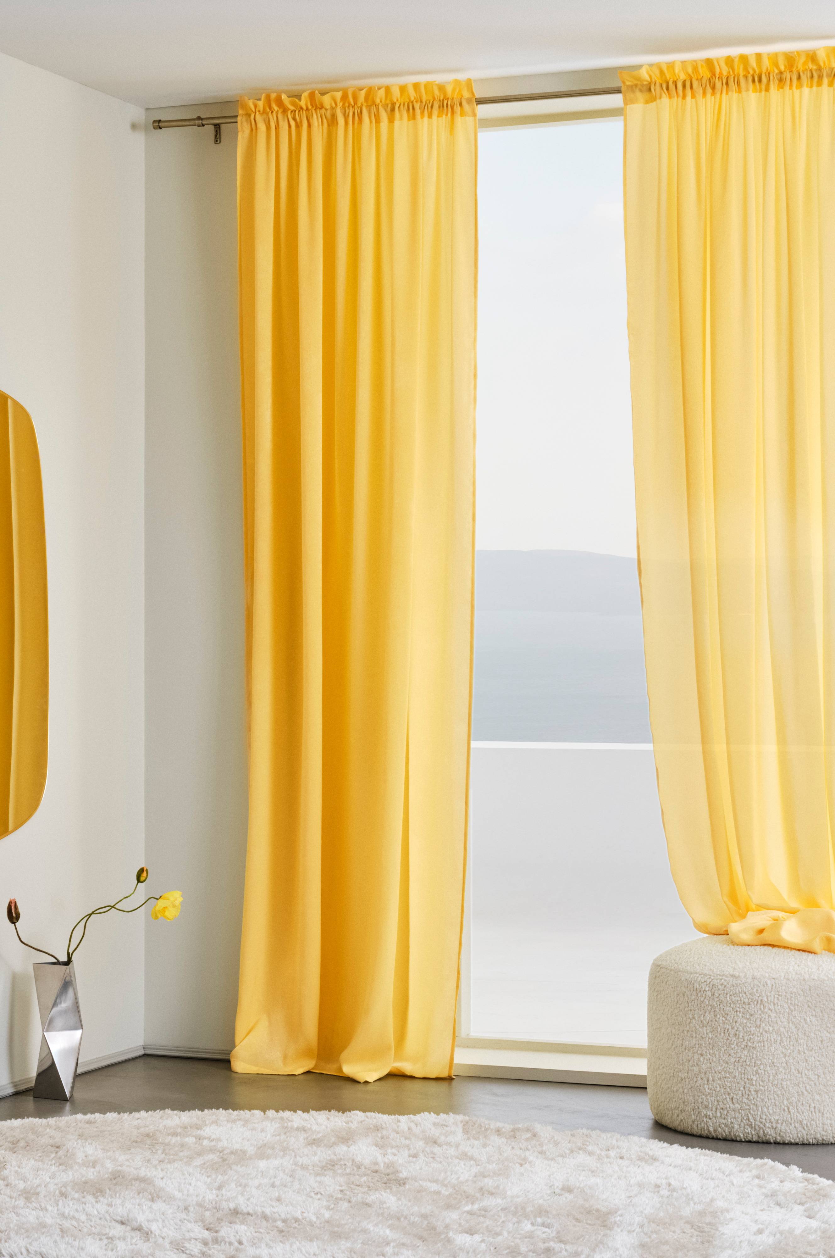 Tynde gardiner, ikke så brede, helst skulle man have dobbelte. Faldet på gardinet bliver flot, vidunderlig farve.