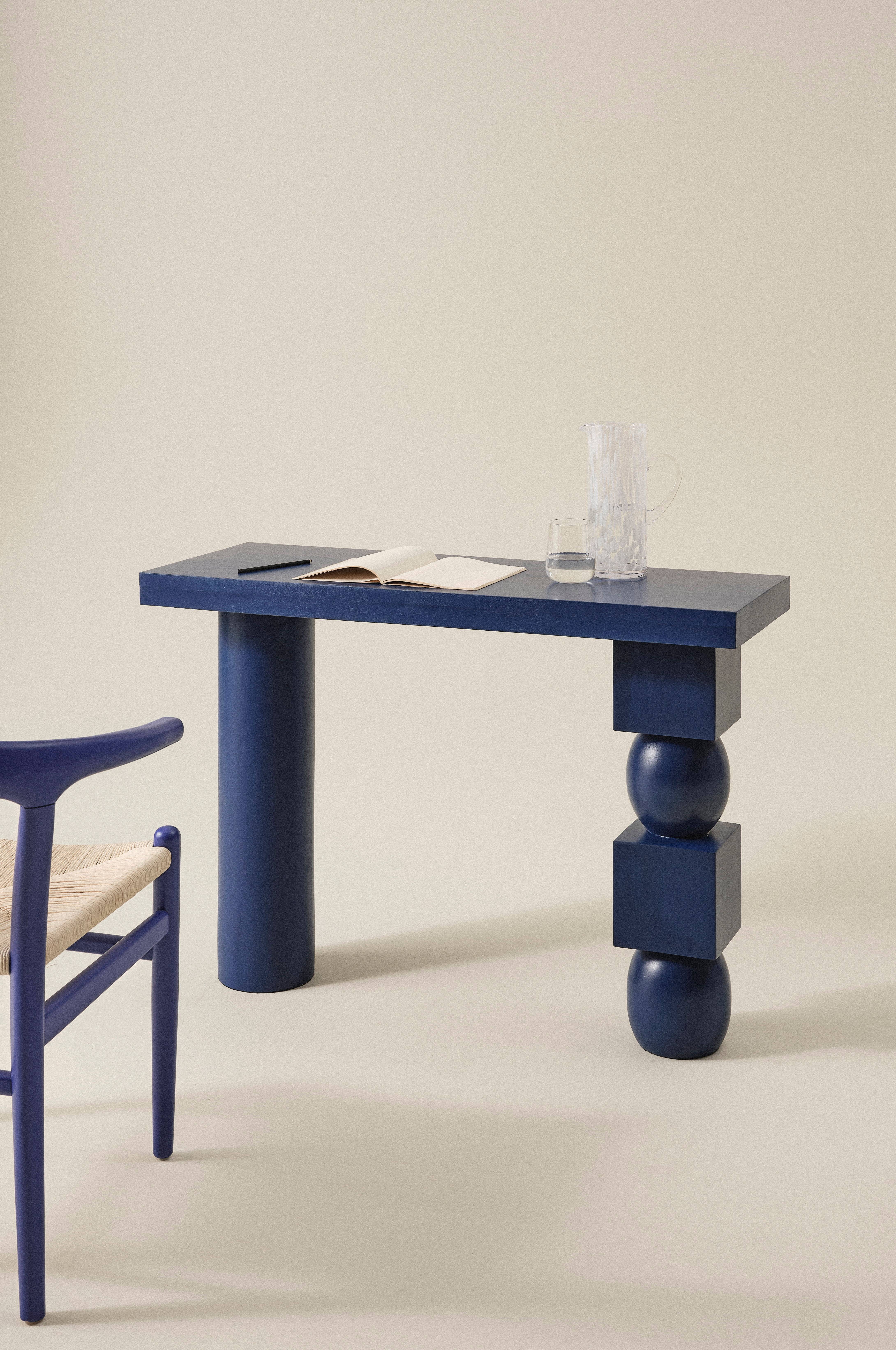 Skrivebord af massivt mangotræ som er malet med sort, vandbaseret farve. GEO har asymmetrisk, skøn form med et lige, rundt ben og et som er sammensat af runde og kvadratiske blokke. GEO ser flot ud som hjemmekontor og er også velegnet som konsolbord. To vægbeslag af metal i bagkanten på bordpladen. Skal færdigsamles. Samlevejledning medfølger.