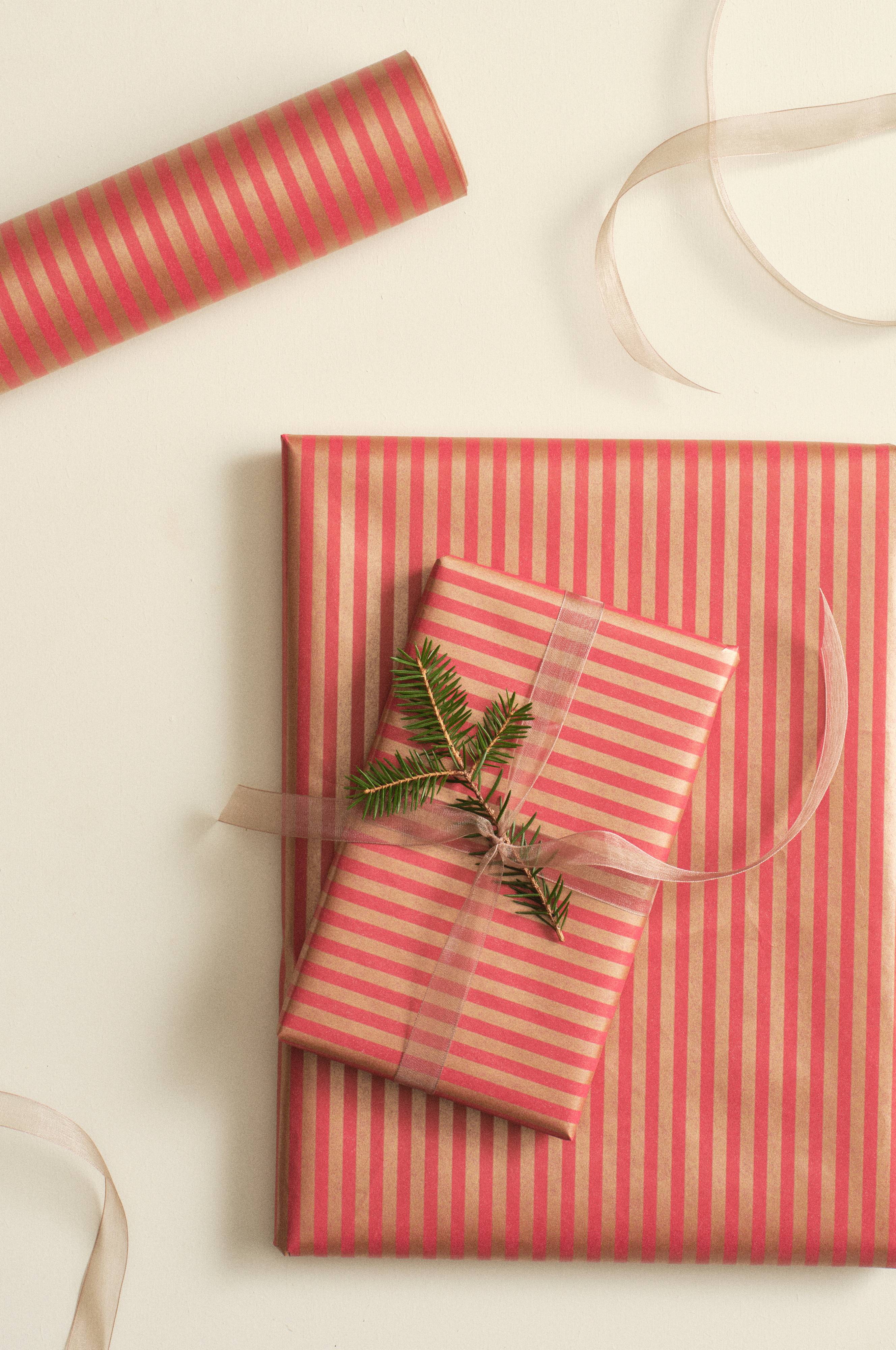 Stribet gavepapir af FSC-certificeret papir. Papiret har printede lyse striber på den ene side og den anden side er ensfarvet i en mørkere nuance. Med gavepapiret GEORGIA kan du altså lave både ensfarvede og stribede gaver og få skøn variation. Fremstillet i Sverige. Vægt 80 g/m².
