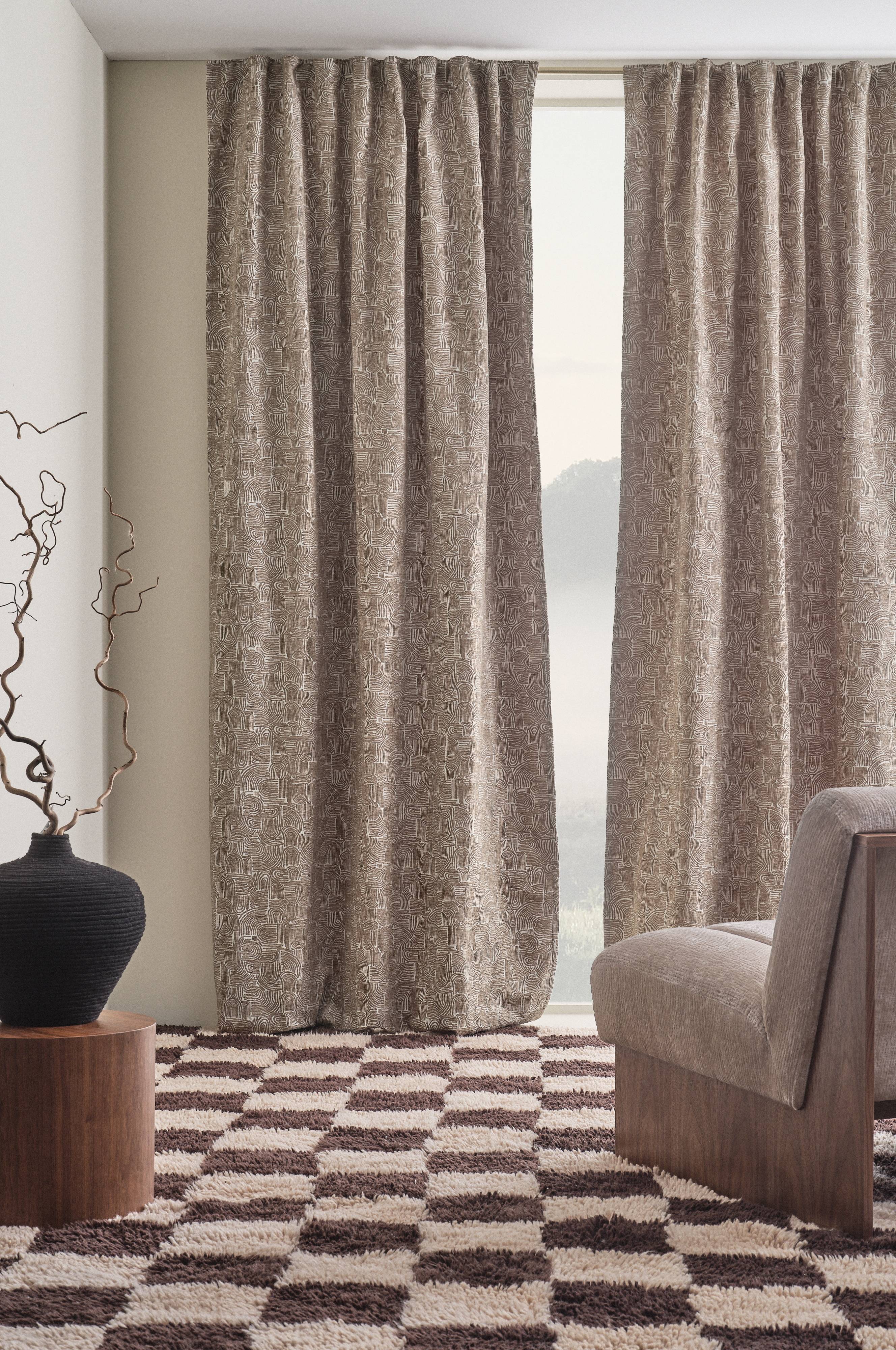 To gardinlængder af jacquardvævet polyester. Et dejligt virvar af bølger i farver på det hvide stof danner et smukt mønsterbillede, der er nemt at matche i et moderne hjem såvel som hjemmet med retrostil. Gardinet har påsyet multifunktionsbånd og kan hænges op med fingerhægter og skjult strop. Stoffets gramvægt er 420 g/m².