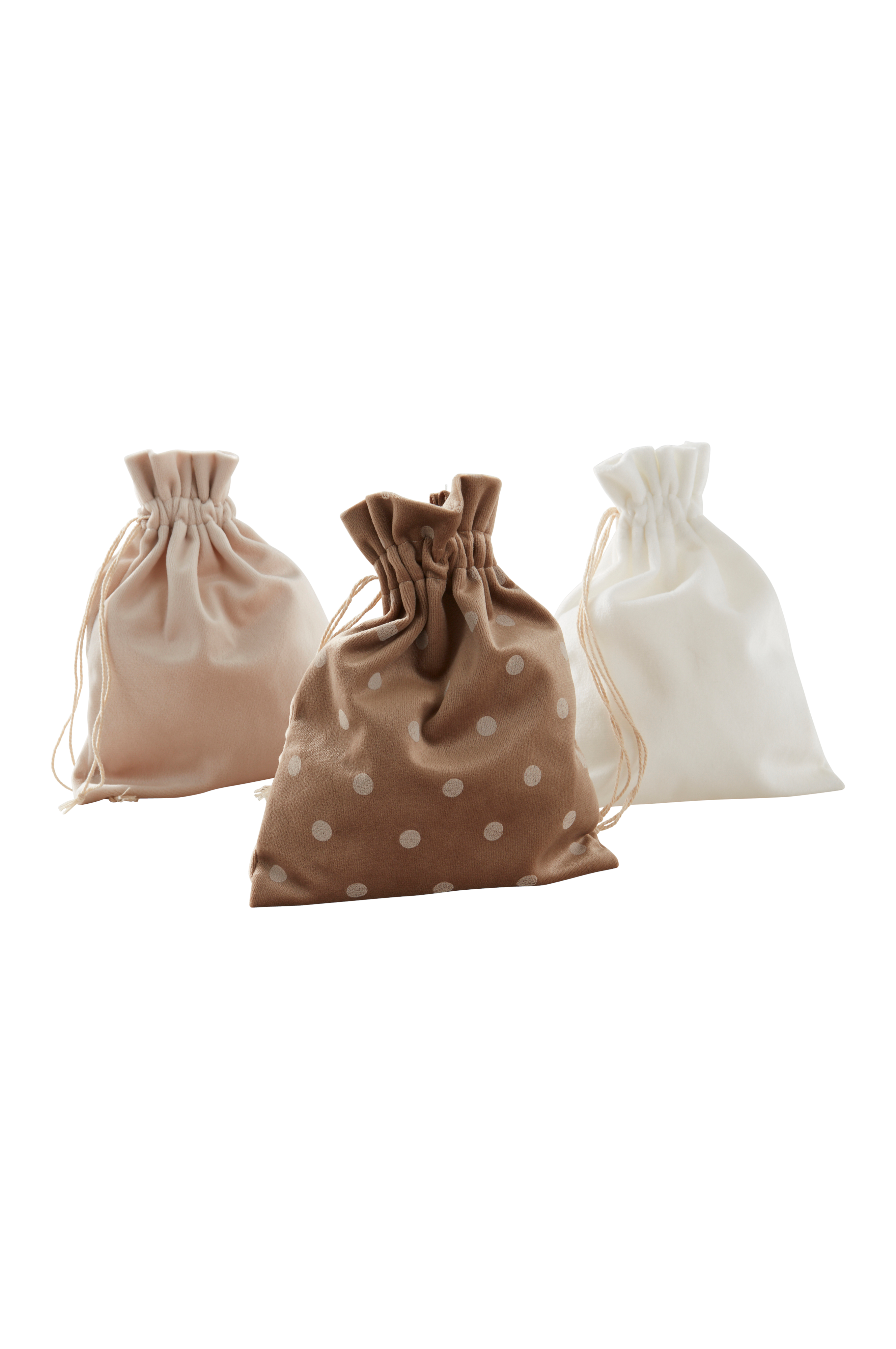 3-pak gaveposer i velour af polyester. De tre velourposer er forskelligeolika, en er prikket og to er ensfarvede i forskellige nuancer. Posen lukkes med snor i løbegang foroven. De er fine til opbevaring af småting og smukke at give væk med gaver i, som ekstra fint gavepapir.