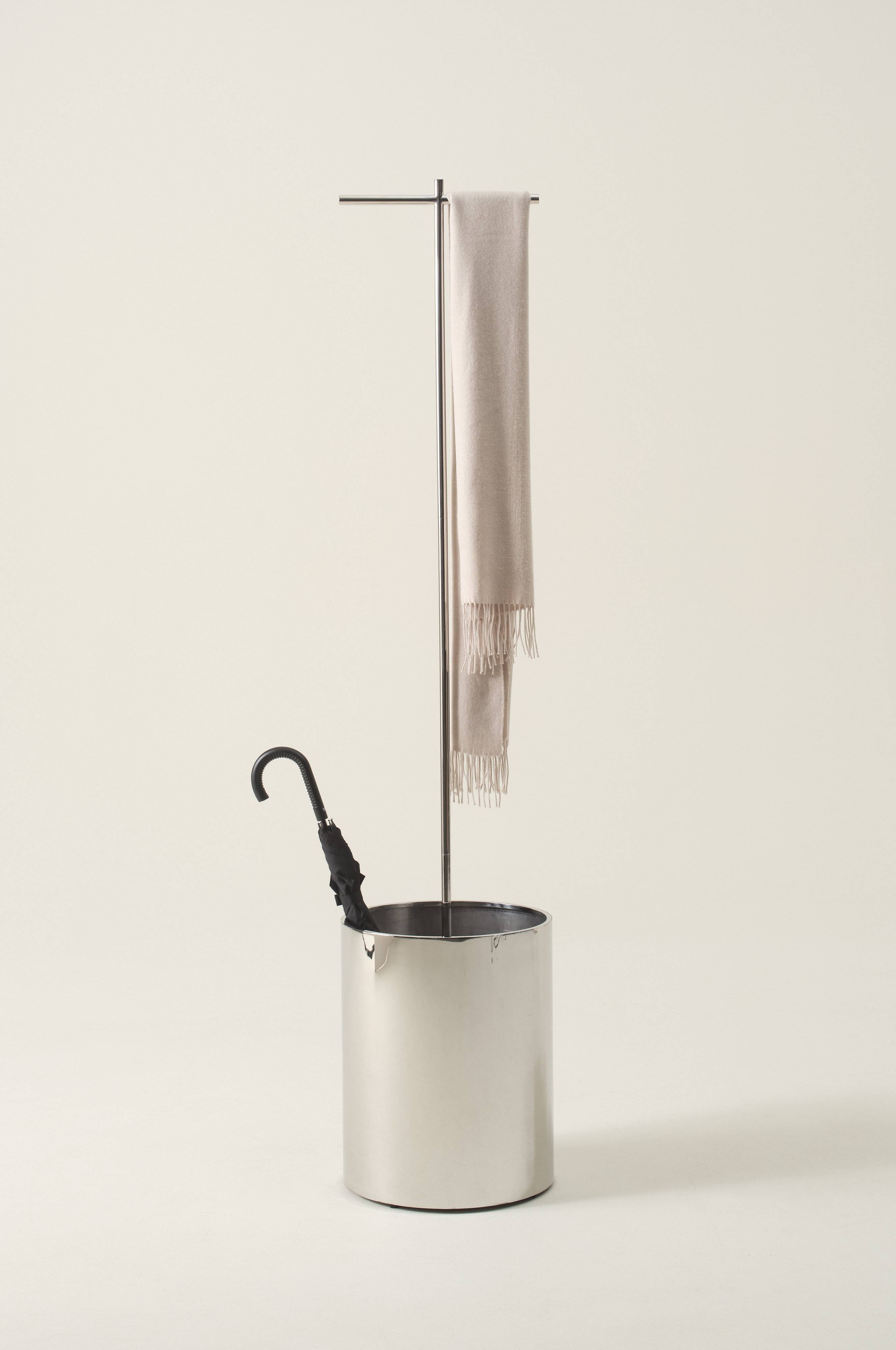 GLAZE er en minimalistisk entreserie til stilren opbevaring i din entre. Paraplystativet er fremstillet af rustfrit stål med forkromet højblank overflade. Paraplystativet opbevarer dine paraplyer på en praktisk måde. Den runde holder er opdelt i fire rum, så paraplyerne adskilles og tørrer nemmere. Øverst er der to knager til tasker eller overtøj.