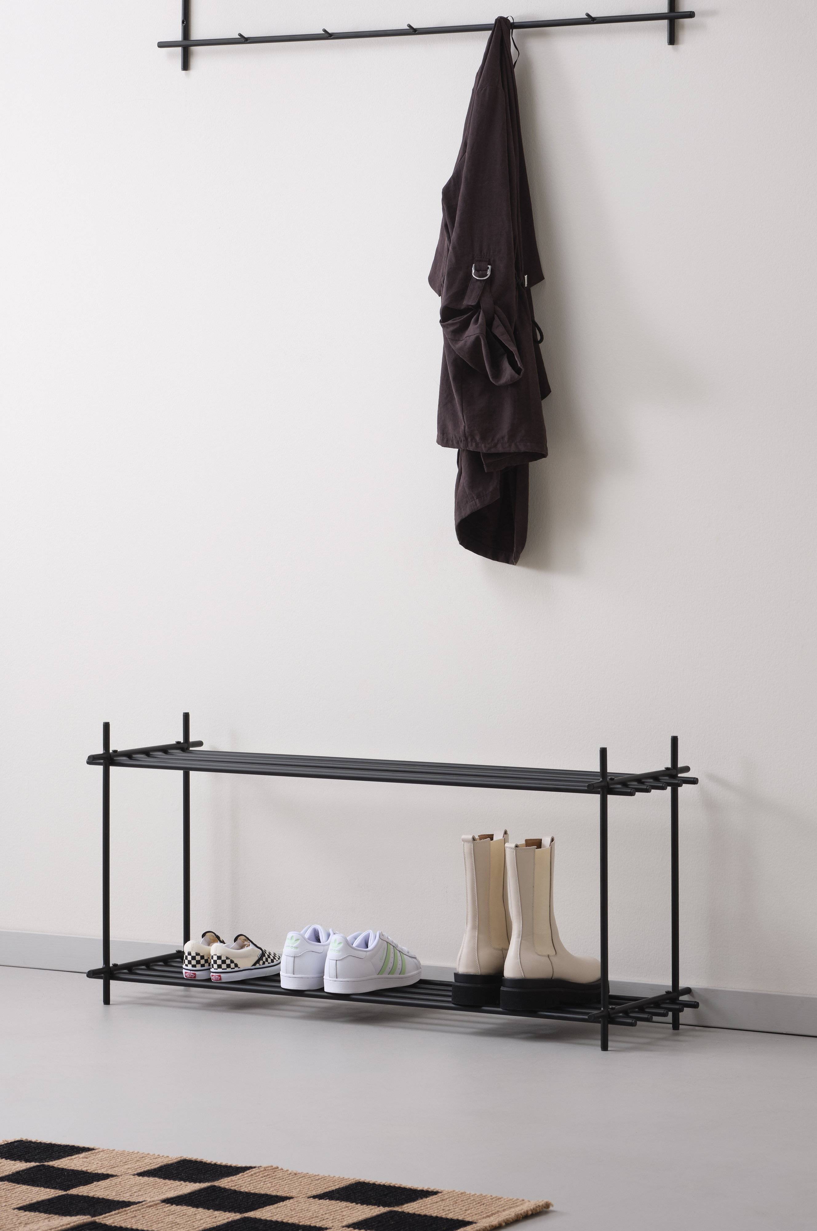 GLAZE er en minimalistisk entreserie til stilren opbevaring i din entre. Skoreolen er fremstillet af jern med sort pulverlakeret overflade. Skoreolen har to hylder til sko.