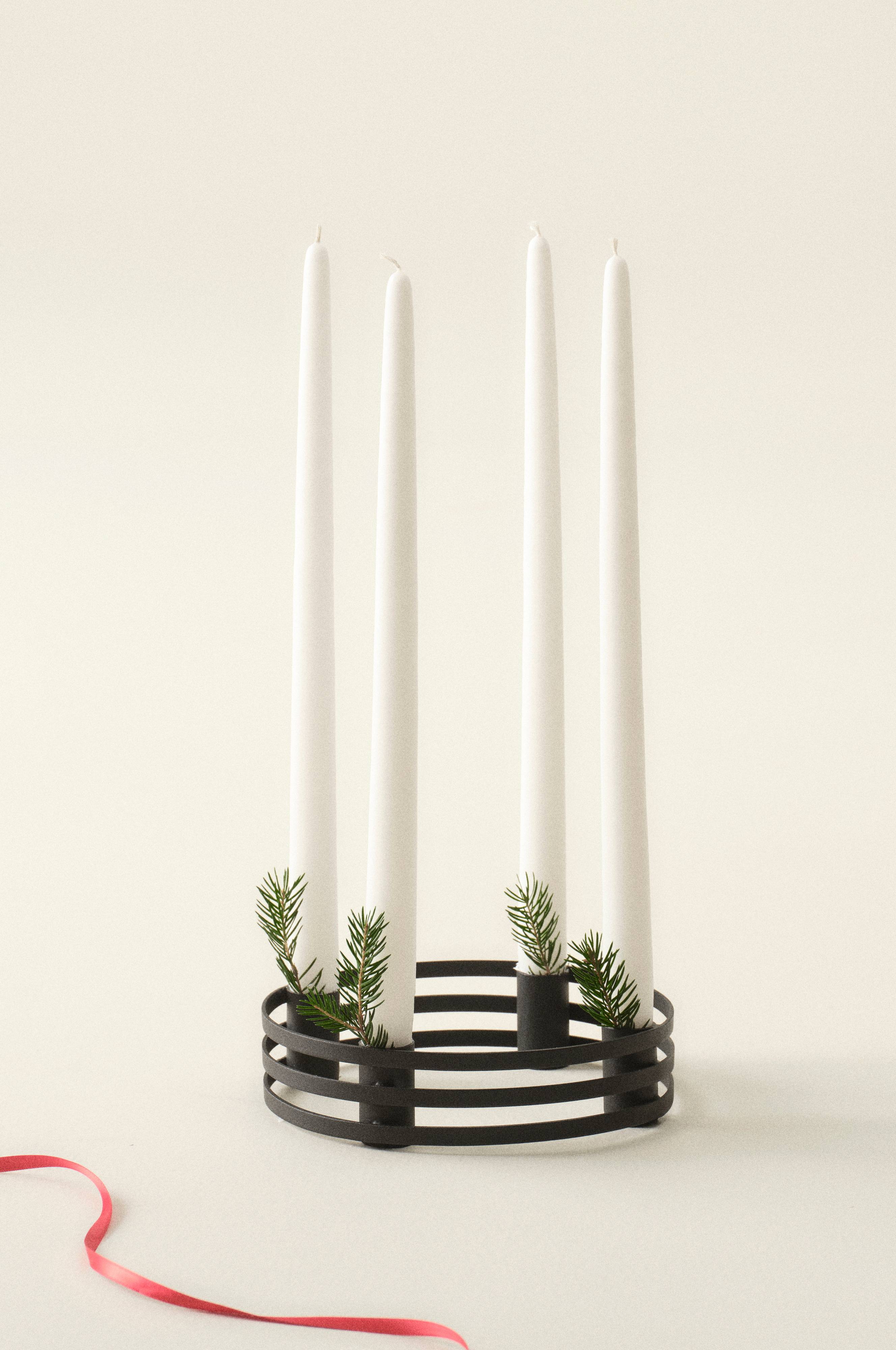 Rund adventslysestage af jern med pulverlakeret overflade. Lysestagen har fire lysholdere. Designet er enkelt og stilrent, hvilket betyder, at den kan bruges året rundt, også når juletiden er slut. Lys medfølger ikke.