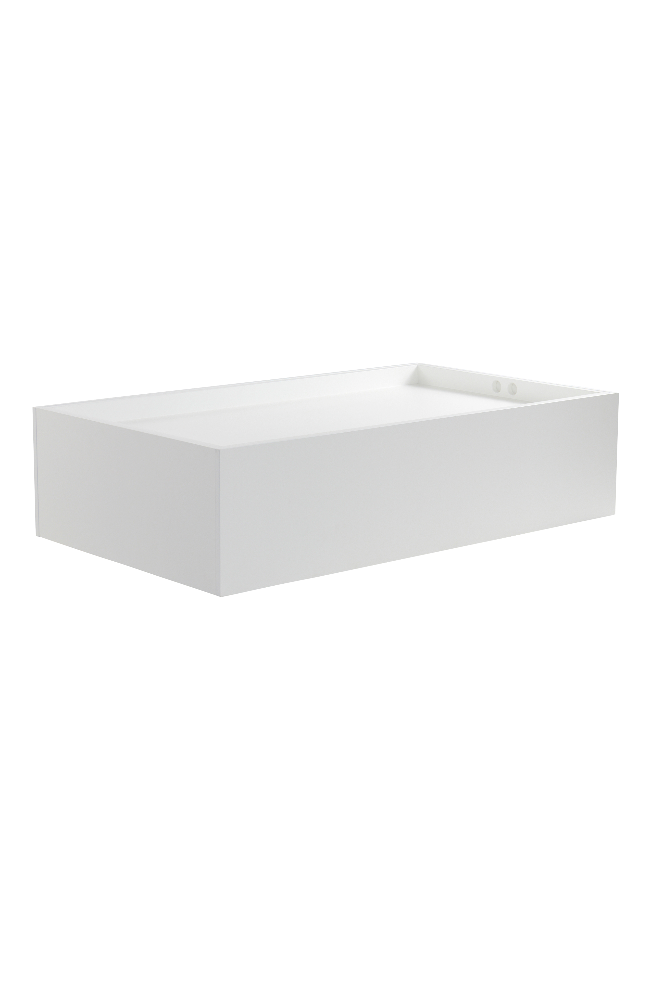 Rektangulært sofabord i MDF. Sofabordets bordplade er udformet som en stor bakke, som sænkes ned i sofabordet, og derunder har du praktisk opbevaring. Bordplade har to runde, dekorative huller som har håndtag på to sider. Det lave bord giver en hyggelig stemning til dit sofahjørne, samtidig med at du udnytter pladsen til opbevaring.