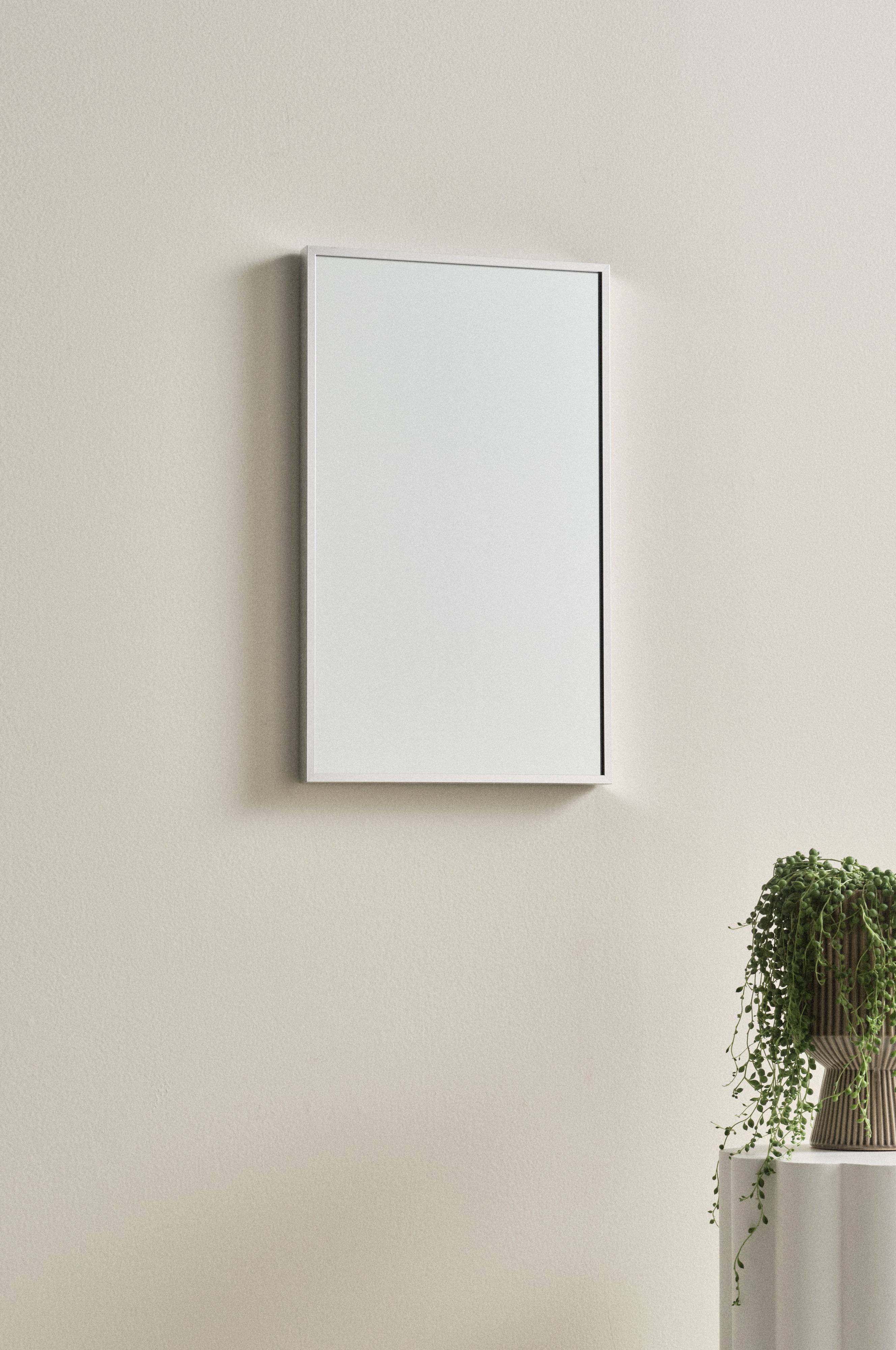 Rektangulært spejl med lækker aluminiumsramme. Rammen har skjult forstærkning af MDF. Tre skjulte beslag på bagsiden, så spejlet kan hænges op både vandret og lodret.