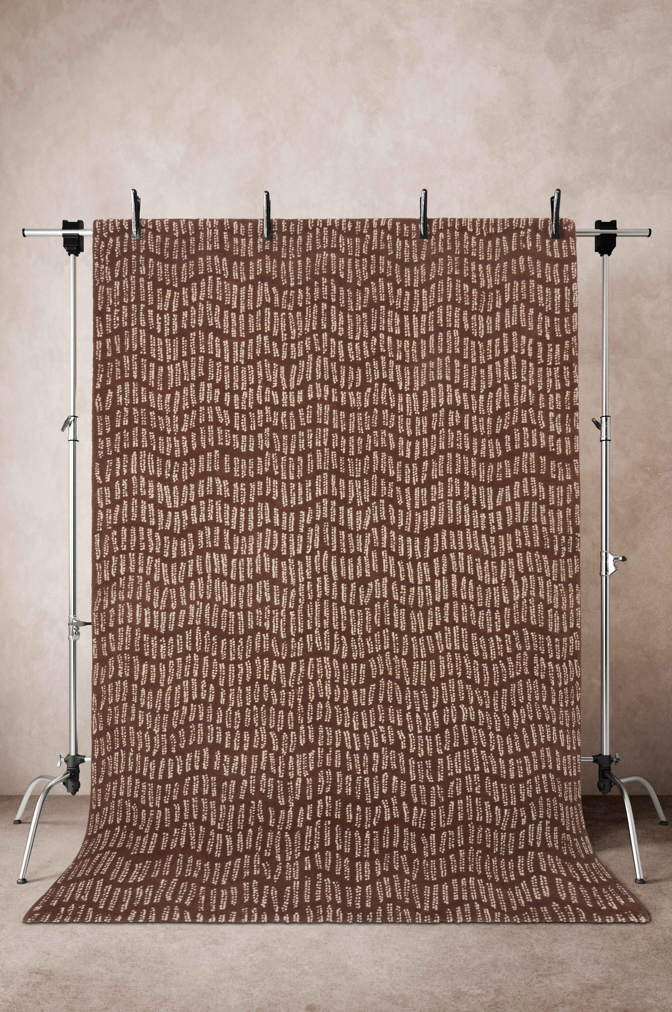 Håndknyttet uldtæppe med effektfuldt mønster, der skabes af forskellige væveteknikker og farven på garnet. Den mørkere grundfarve er kortklippet, tæt luv, mens de lyse dekorative striber er luv i løkker, der skaber mønsteret. Uld giver et naturligt varmt og praktisk smudsafvisende tæppe. Luvhøjde 1-1,1 cm. Tykkelse 1,2-1,4 cm. 3800-4000 g/m².