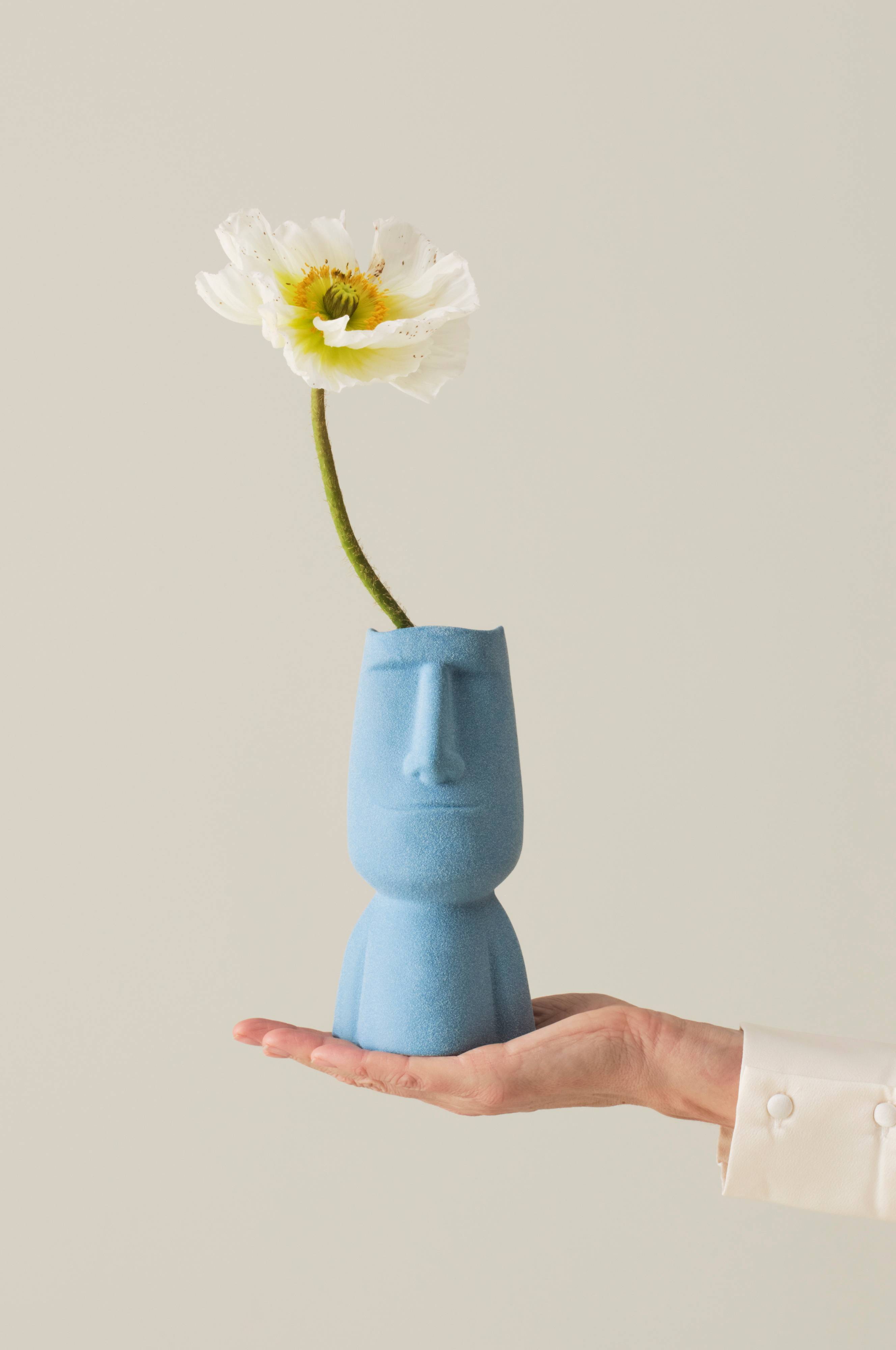 Vase af keramik, formet som en skulptur, GRUMPY kan anvendes både som dekoration og som vase. Vasen er glaseret i hånden i en blød blå nuance og overfladen har en sandfinish. Indersiden er også glaseret. Det fine håndværk gør, at hver vase er unik. Der kan trænge fugt igennem keramik.