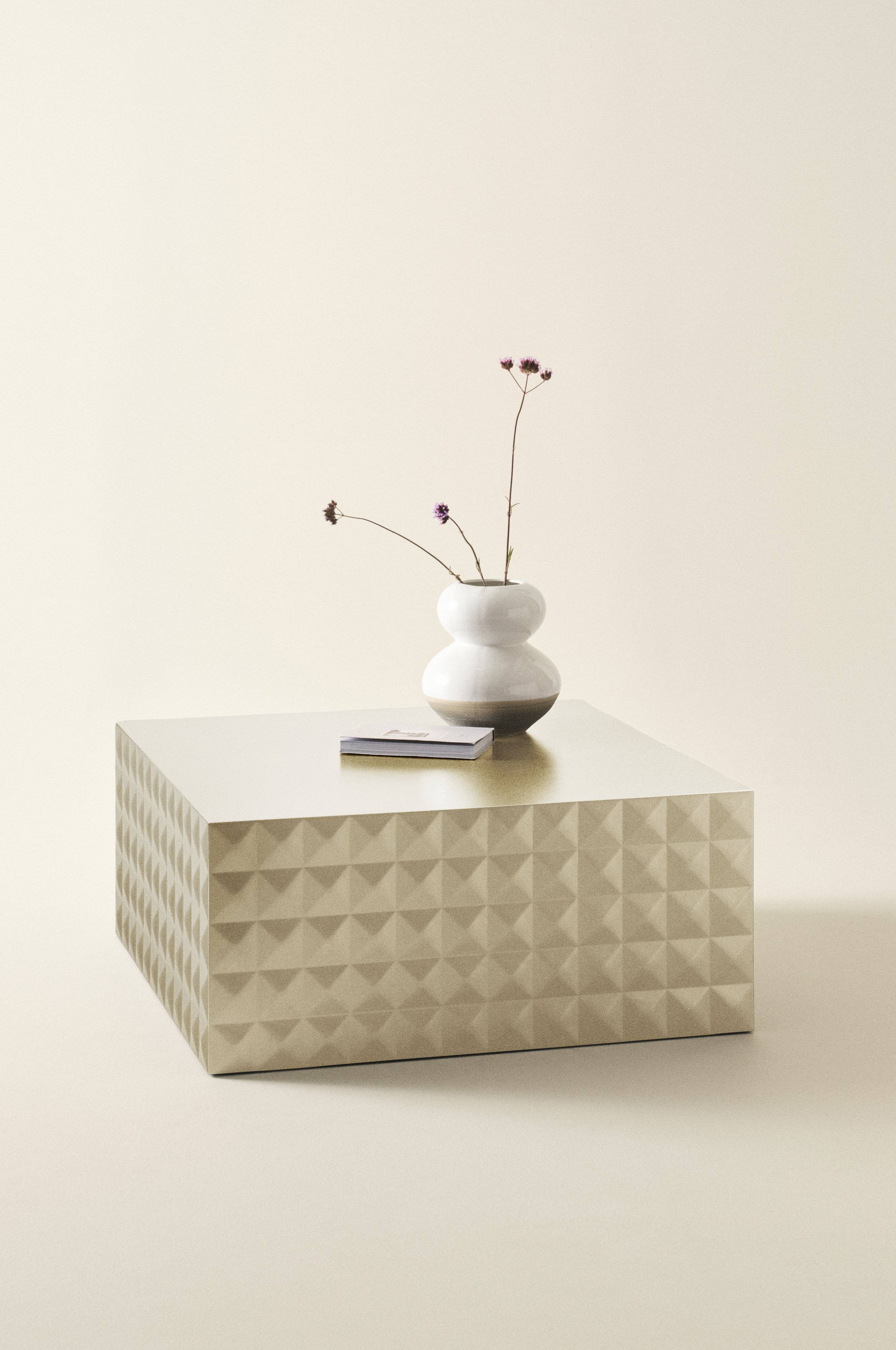 Kvadratisk sofabord af FSC-mærket MDF som er lakeret med mat farve. Bordpladen er glat mens siderne har effektfuldt geometrisk mønster med lækker 3D-effekt.