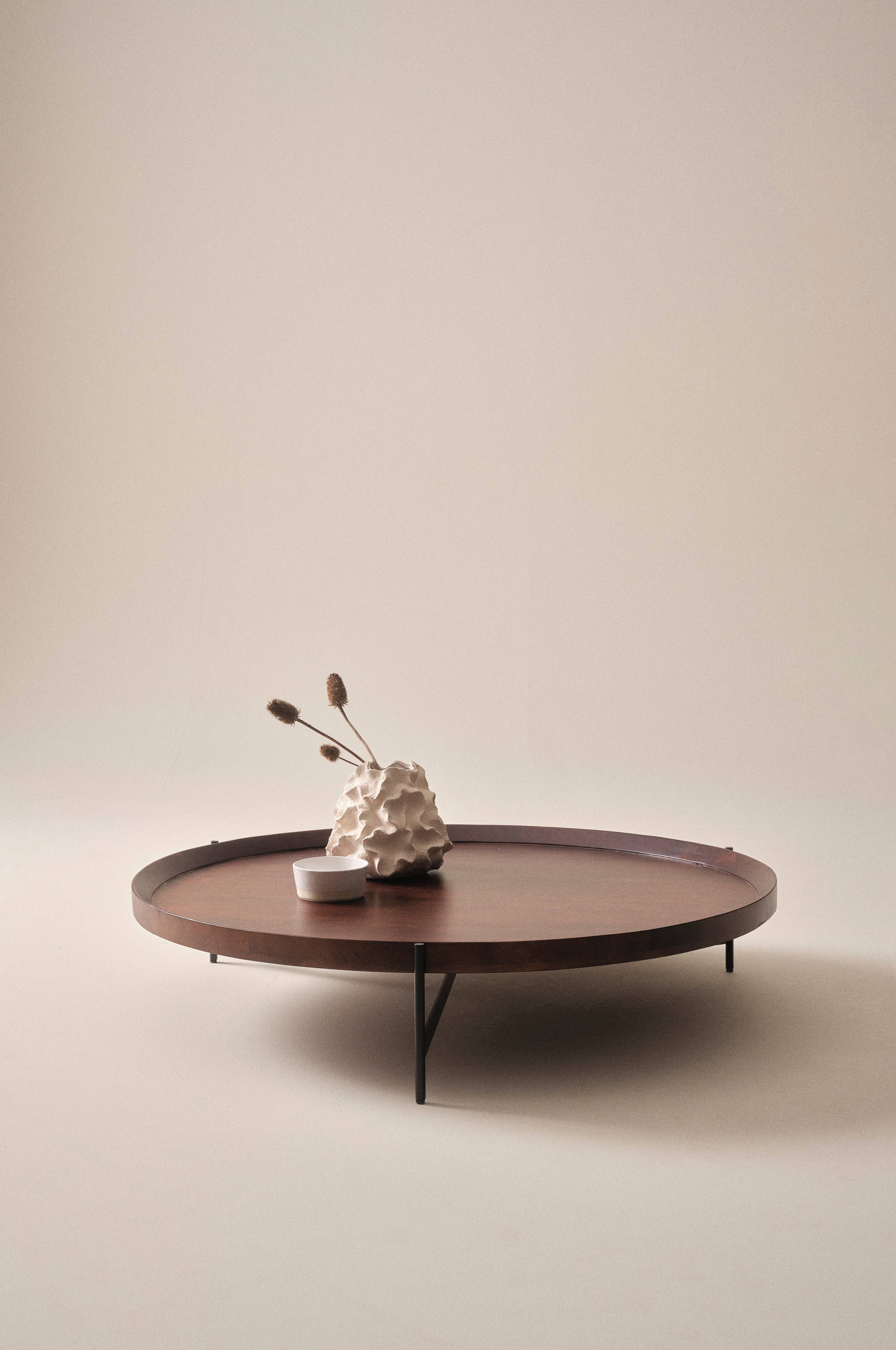 Rundt sofabord af jern, mangotræ og mangofinér. Bordpladen som har en flot faset kant rundt om er i mangotræ med fin mørk mahognifinish. Bordet står stabilt på tre ben og understellet er i pulverlakeret jern med mat overflade. Det lave bord har et internationalt udtryk med et moderne touch.