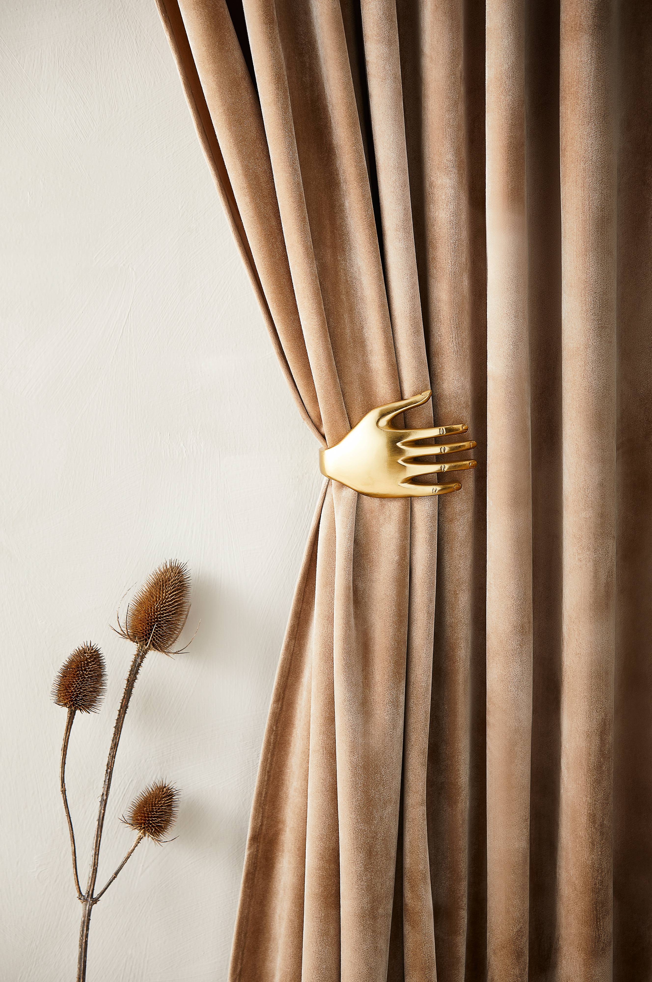 2-pak gardinholder i aluminium formet som to hænder. Stilrene gardinholdere, som giver din gardinophængning et løft og bliver en flot, iøjnefaldende detalje.