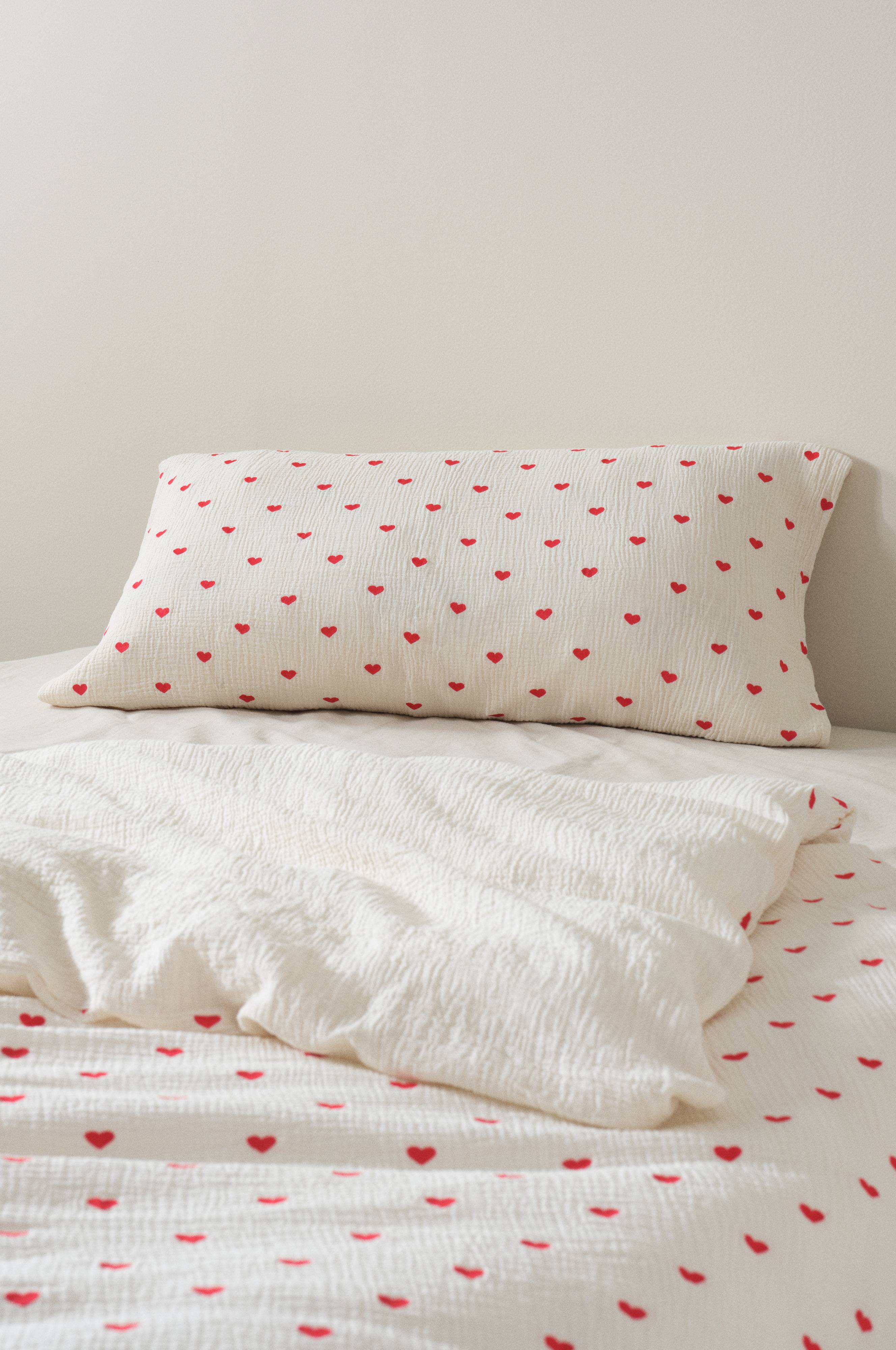 1-pak pudebetræk i skøn, økologisk bomuldsmusselin med broderede hjerter. Musselin er et blødt tyndt stof i to lag, vævet med boblende effekt, hvilket gør stoffet blødt og ekstra praktisk. Du behøver ikke at stryge eller rulle. Det behagelige musselin er skønt at sove i. Bagsiden er ensfarvet. Trådtæthed på 178 tc. (Trådtætheden angiver antal tråde, Thread Count, pr. kvadrattomme i et stof. Jo højere trådtæthed desto højere kvalitet.)