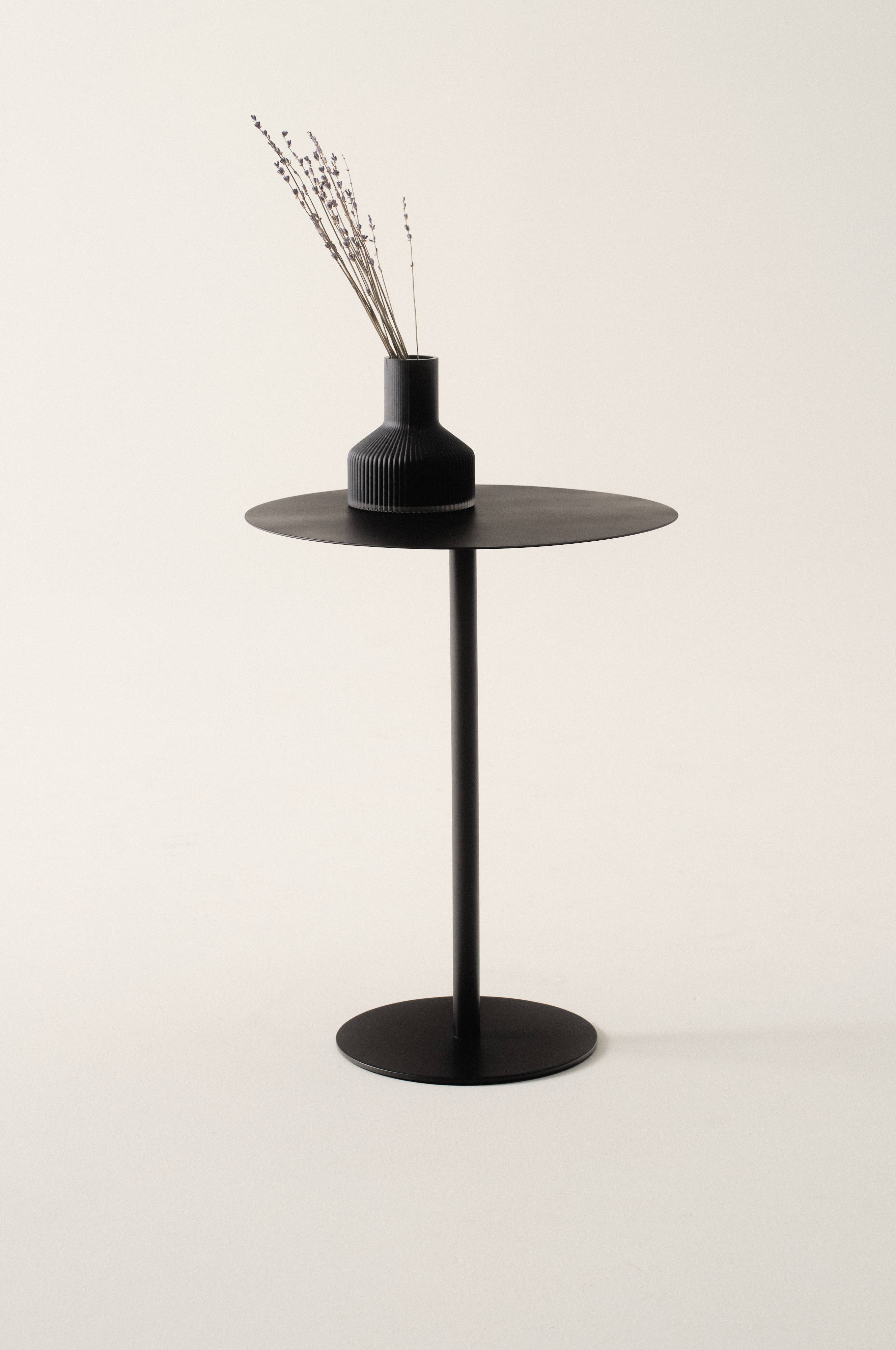 Rundt sidebord af jern. HEBY har et flot udtryk takket være den tynde bordplade og slanke søjlebund. Sidebordet er helt ensfarvet og pulverlakeret med mat farve.