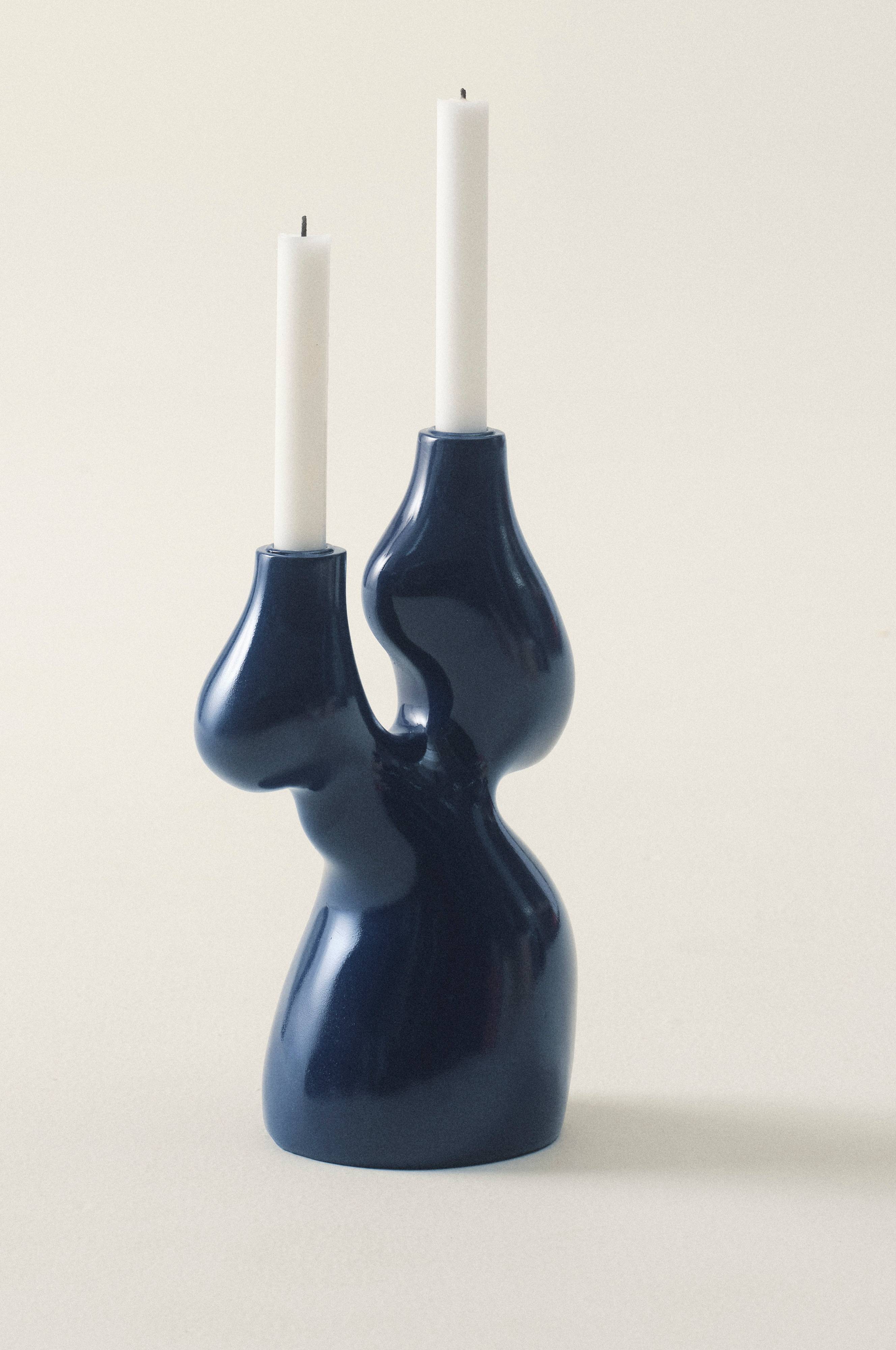 Håndlavet lysestage af polyresin. Lysestage er blød og bølgende i formen og har to lysholdere. Det fine håndværk gør hver lysestage unik. Lys medfølger ikke.