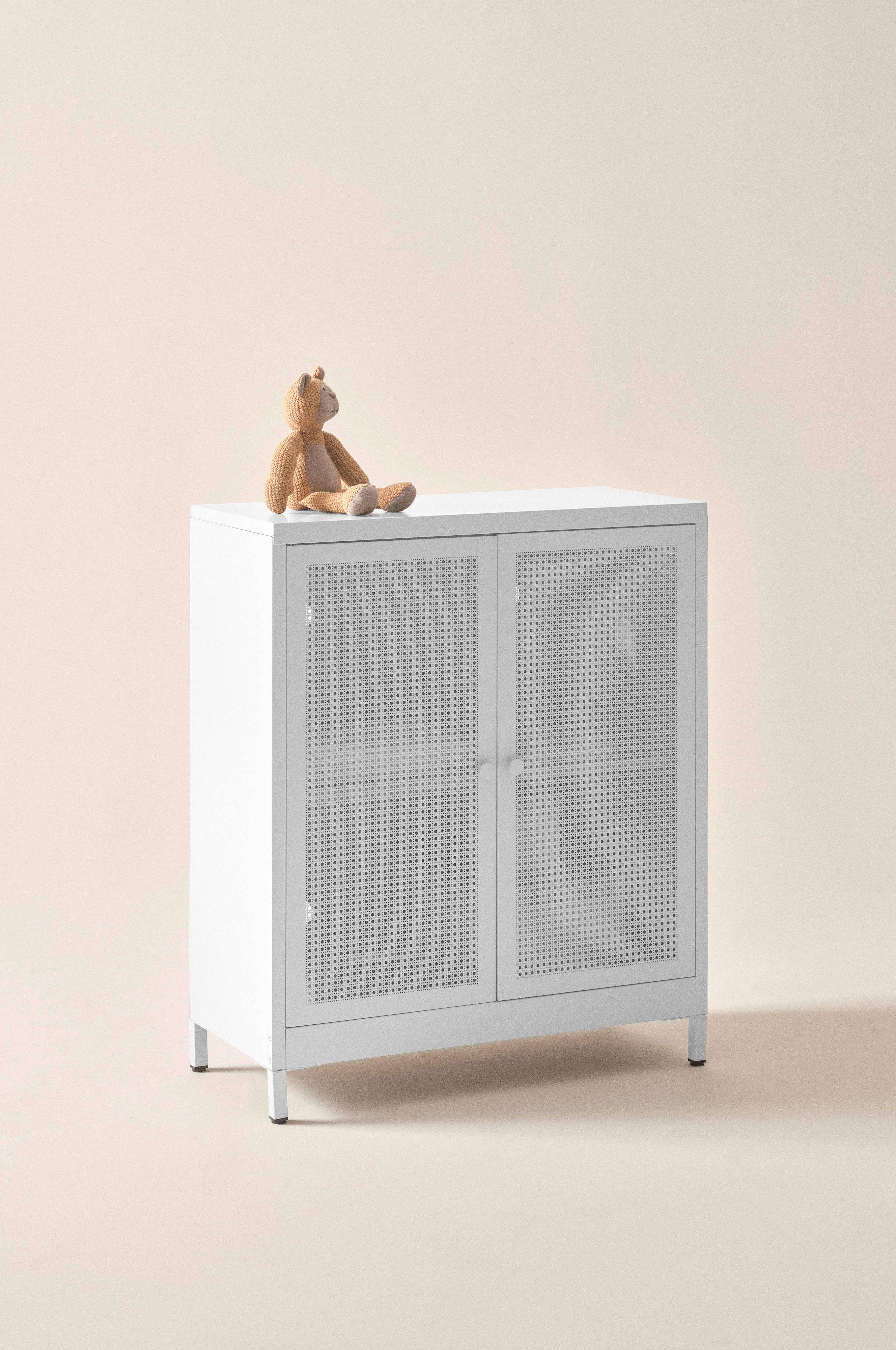 Børneskab i pulverlakeret metal. Lågerne har perforeret mønster som ligner rotting, selvom de er af robust stål. Indvendigt har garderobeskabet en fast hylde. Med ett skab bliver det nemt at holde orden på alt fra legetøj til spil og bøger. Af sikkerhedsmæssige årsager skal skabet monteres mod en væg, så det ikke kan vælte. Vægbeslag medfølger. Nogen montering kræves. Samlevejledning medfølger.