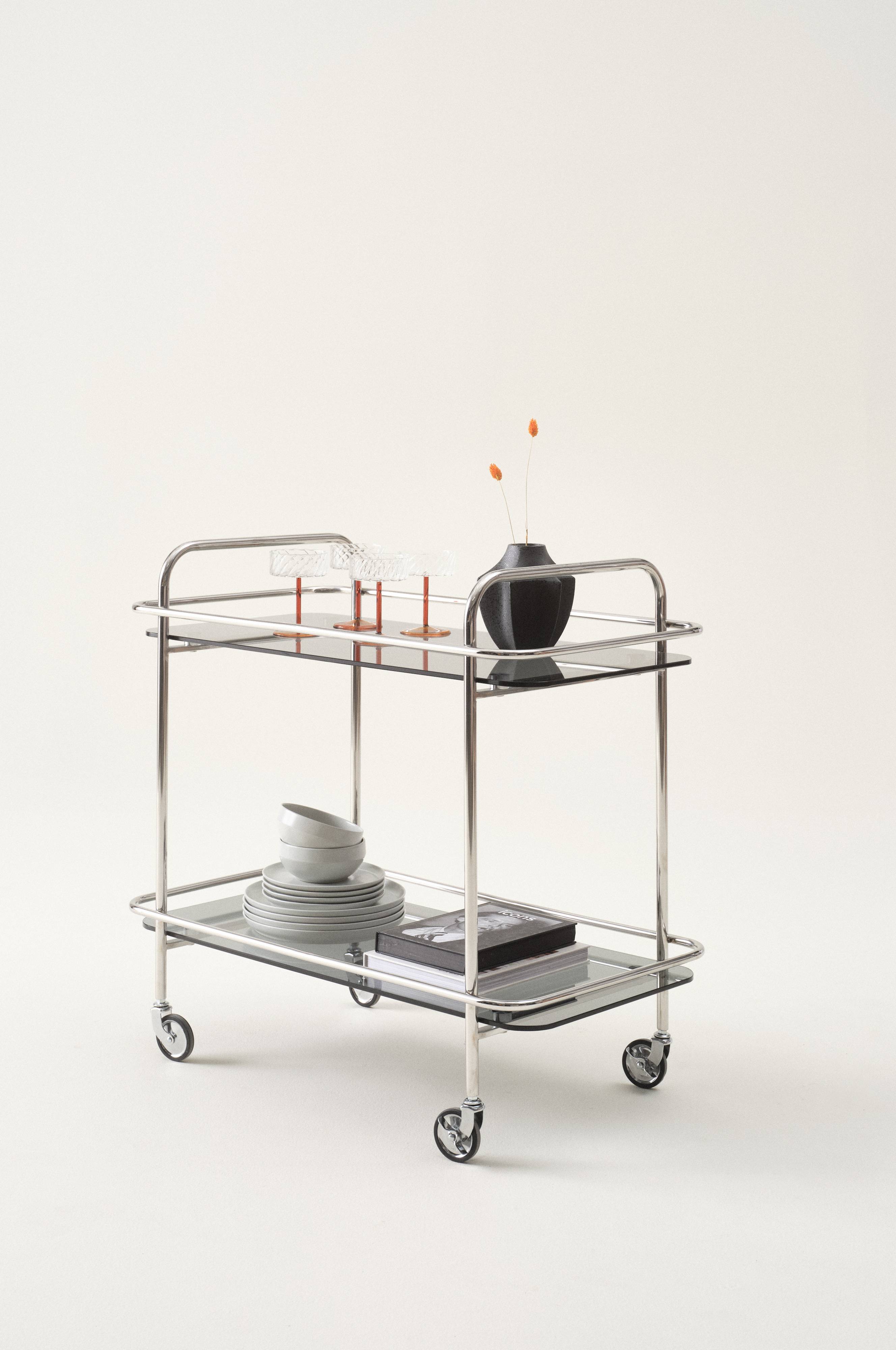 Serveringsvogn af rustfrit stål med poleret overflade, som er blank og glinsende. Serveringsvognen har hylder af lidt mørkere glas. Fordi den er udstyret med fire hjul, kan du nemt rulle vognen med dig og kan bruge den som sofabord, aflastningsbord, sidebord eller barvogn. To af hjulene kan låses. Den elegante stil med glashylder bliver et luksuriøst indslag i din indretning. Skal færdigsamles.