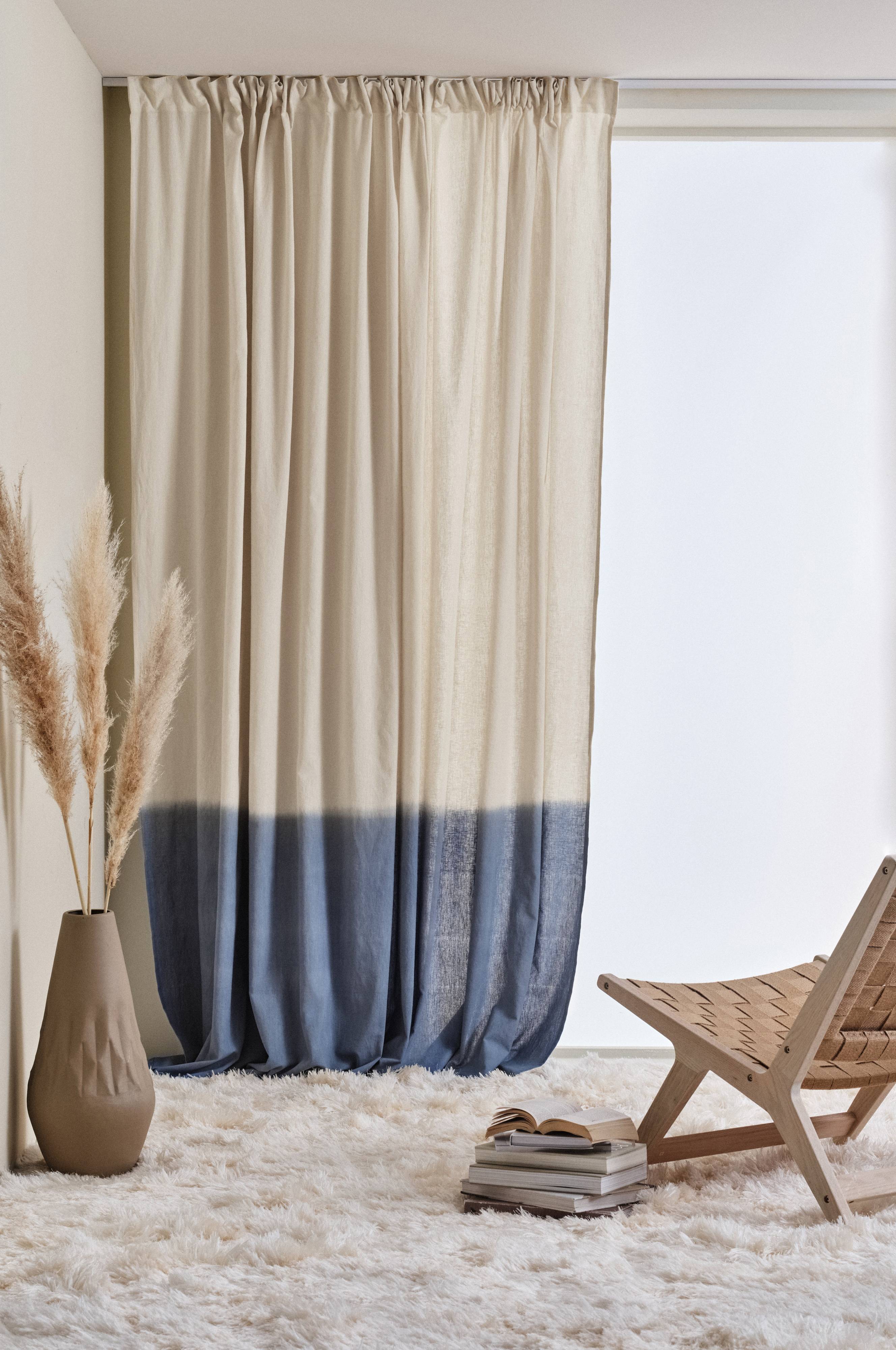 En gardinlængde af bomuld og hør i fin kombination, stoffet har let lærredsstruktur. Gardinlængden er skønt farvet med afvigende nuance forneden, den diffuse overgang giver et lækkert batiklook. Den ekstra brede længde har påsyet multifunktionsbånd. Gardinet kan hænges op med fingerhægter, løbegang samt skjult strop.