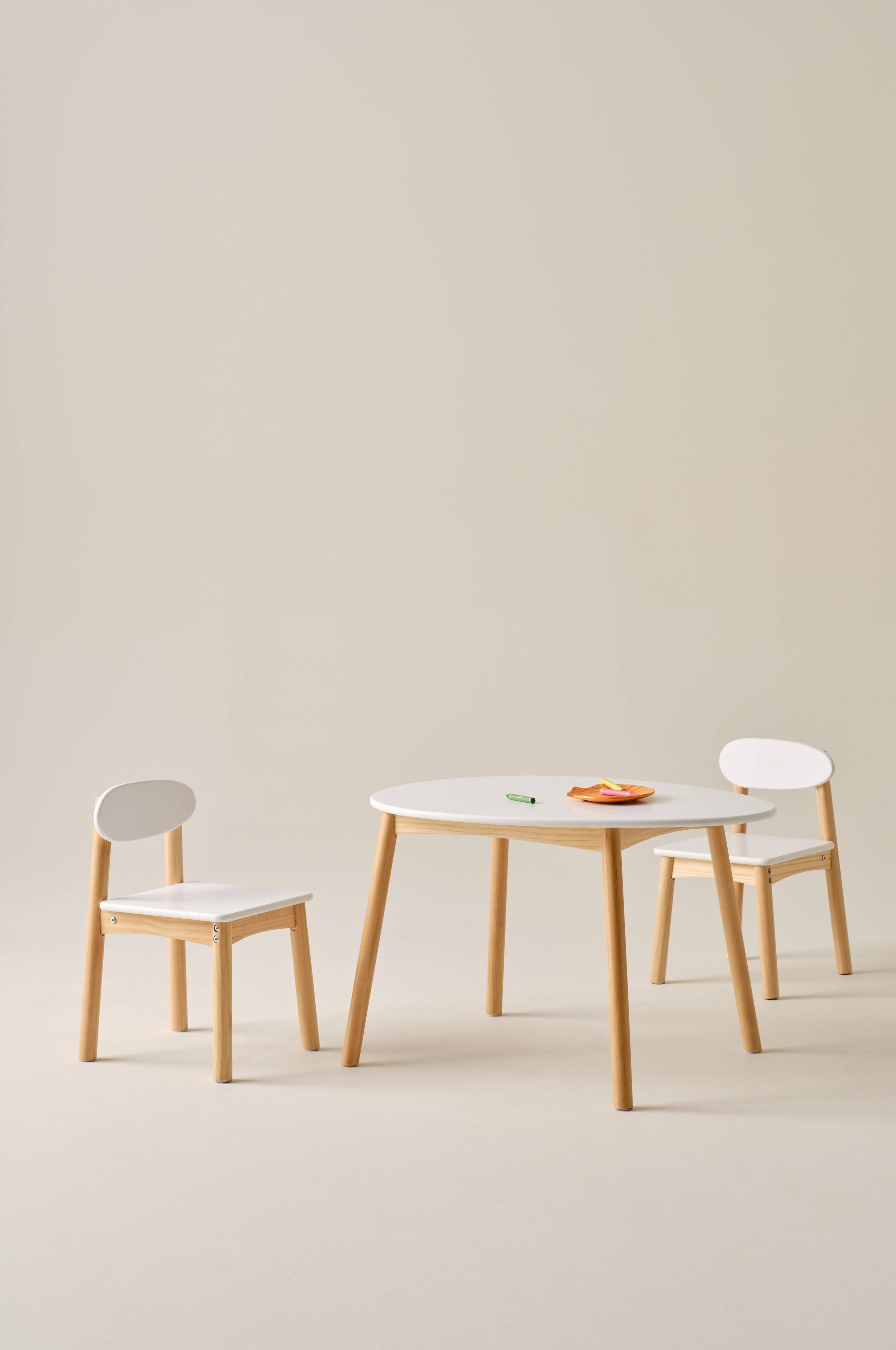 HULTA MINI-spisegruppen er en perfekt blanding af sjov og funktion for børn i alderen 2-8 år. Et æggeformet bord og to matchende stole skaber et indbydende setup til leg og måltider. Bord- og stolesættet er fremstillet af robust MDF og fyrretræ og er designet til at supplere den moderne æstetik i hjemmet. Ideelt til at tilføje et trendy touch til ethvert børneværelse eller legeområde.